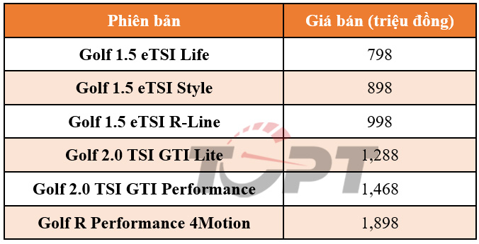 Giá bán các phiên bản Volkswagen Golf tại Việt Nam.
