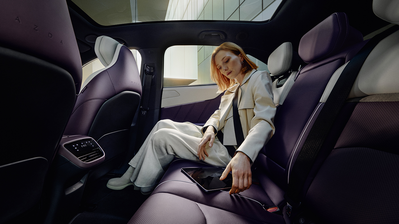 Và để bước chân ra khỏi biên giới Trung Quốc, tạo khác biệt hẳn so với chiếc EZ-60, Mazda mang nội thất xe áp dụng triết lý "Ma" (không gian trống) của Nhật Bản với vật liệu giả da Maztex cao cấp. Điểm nhấn là màn hình giải trí khổng lồ 26 inch tích hợp điều khiển bằng cử chỉ (như dấu "OK" để dẫn đường) và hệ thống âm thanh 23 loa công suất 1.280W.