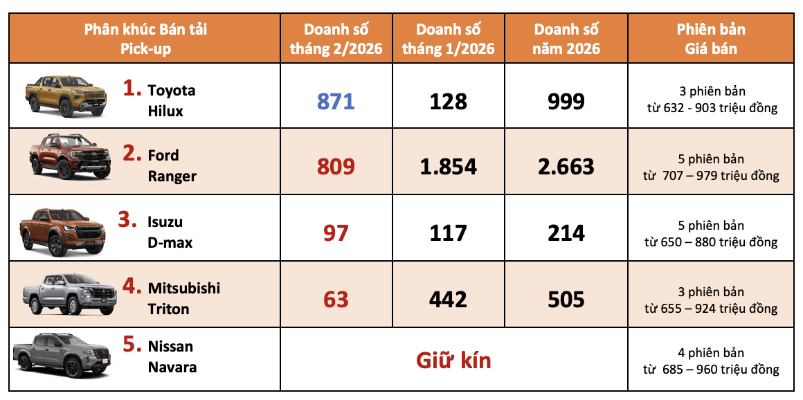 - Thị trường ô tô Việt Nam: Phân khúc xe bán tải và SUV tháng 2/2026 - Toyota Hilux tạo "đột biến" với vị thế của Ford Ranger