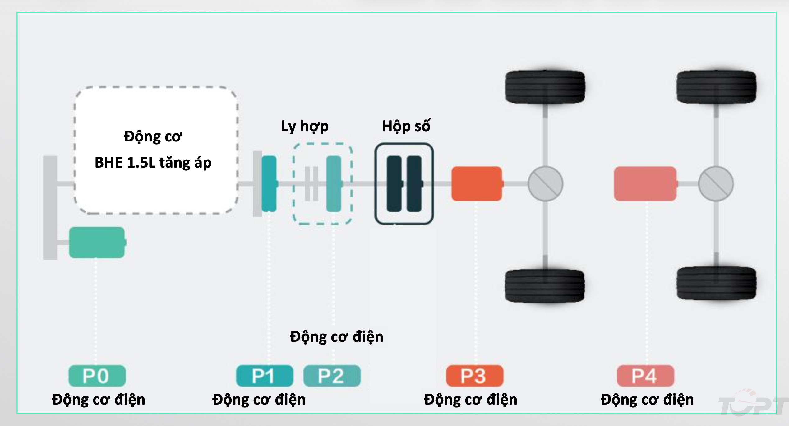 Mô tơ điện vận hành chính có tên gọi P3: Nằm sau hộp số, trên trục đầu ra (output shaft) truyền lực xuống hai bánh trước để dẫn động và hỗ trợ phanh tái sinh năng lượng