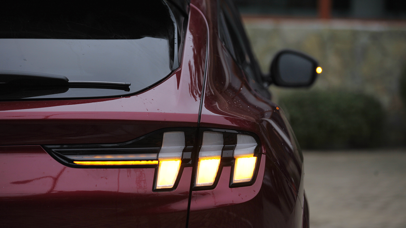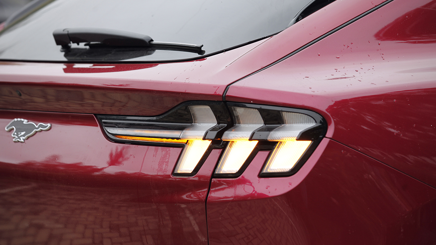 Ngay từ cái nhìn đầu tiên, Mustang Mach-e đã khẳng định nguồn gốc của mình, dù nằm trong phân khúc SUV điện. Các nhà thiết kế của Ford đã khéo léo giữ lại những DNA Mustang cốt lõi: Nắp capo kéo dài mạnh mẽ với chi tiết kinh điển gợi nhớ đến các thế hệ Mustang động cơ đốt trong V8, các đường gân bên hông xe tạo hình ảnh Cơ bắp, nhấn mạnh tính hiệu suất và tốc độ đặc trưng của dòng xe. Trong khi đó cụm đèn hậu ba thanh dọc mang tính Biểu Tượng là đặc điểm nhận dạng không thể thiếu, giúp dễ dàng nhận ra một chiếc Mustang ngay cả trong đêm tối.