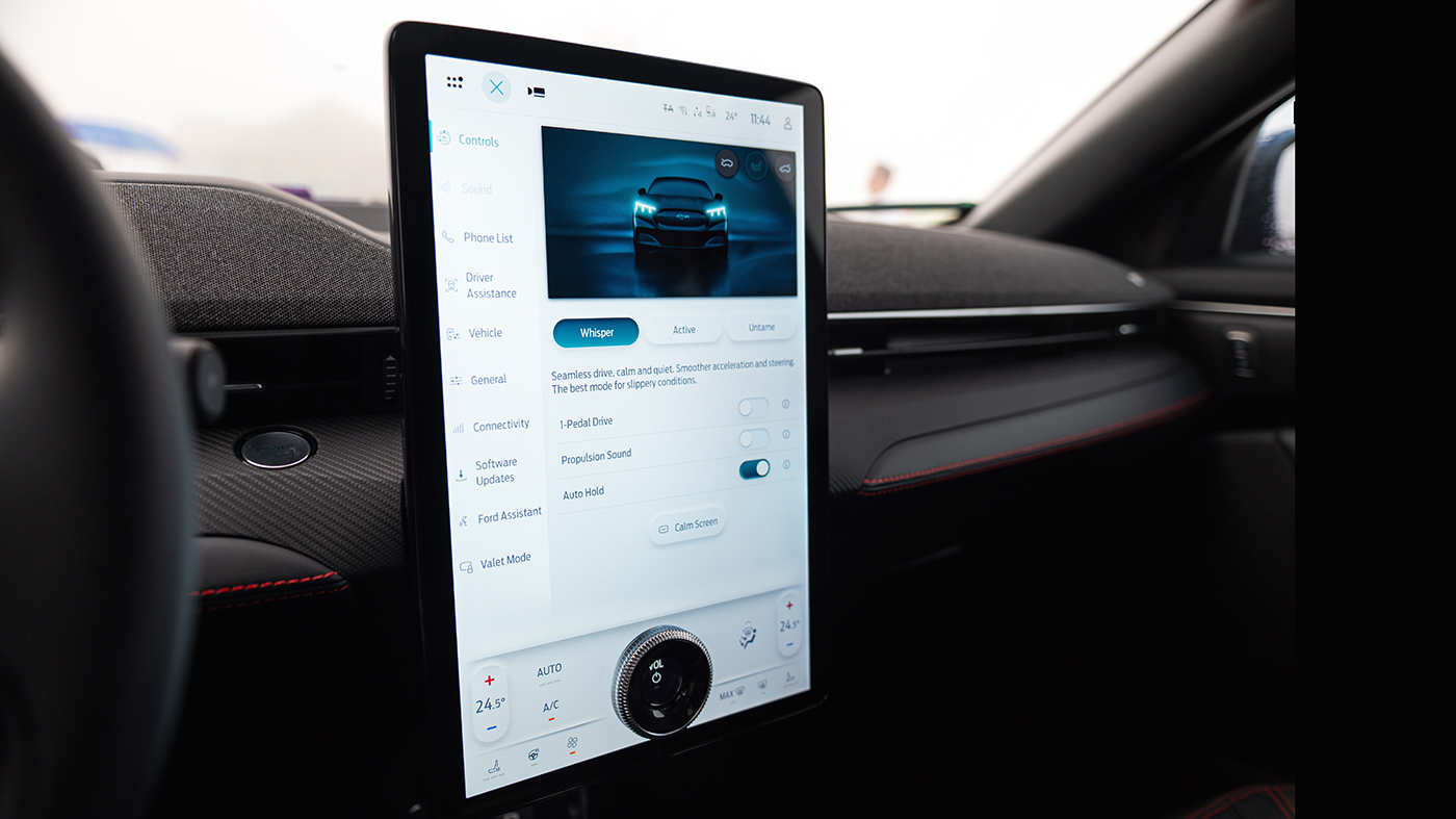 Chế độ Untame khai phá tối đa tiềm năng vận hành của Mustang Mach-E: vô-lăng và phản hồi chân ga trở nên nhạy bén hơn, đồng thời mang đến cảm giác như đang về số khi giảm tốc. Kết hợp hiệu năng ấy là trải nghiệm âm thanh tăng cường trong khoang lái, hệ thống đèn nội thất chuyển sang màu cam thể thao và màn hình hiển thị các vạch động lực học tương ứng với lực khi tăng tốc và vào cua.