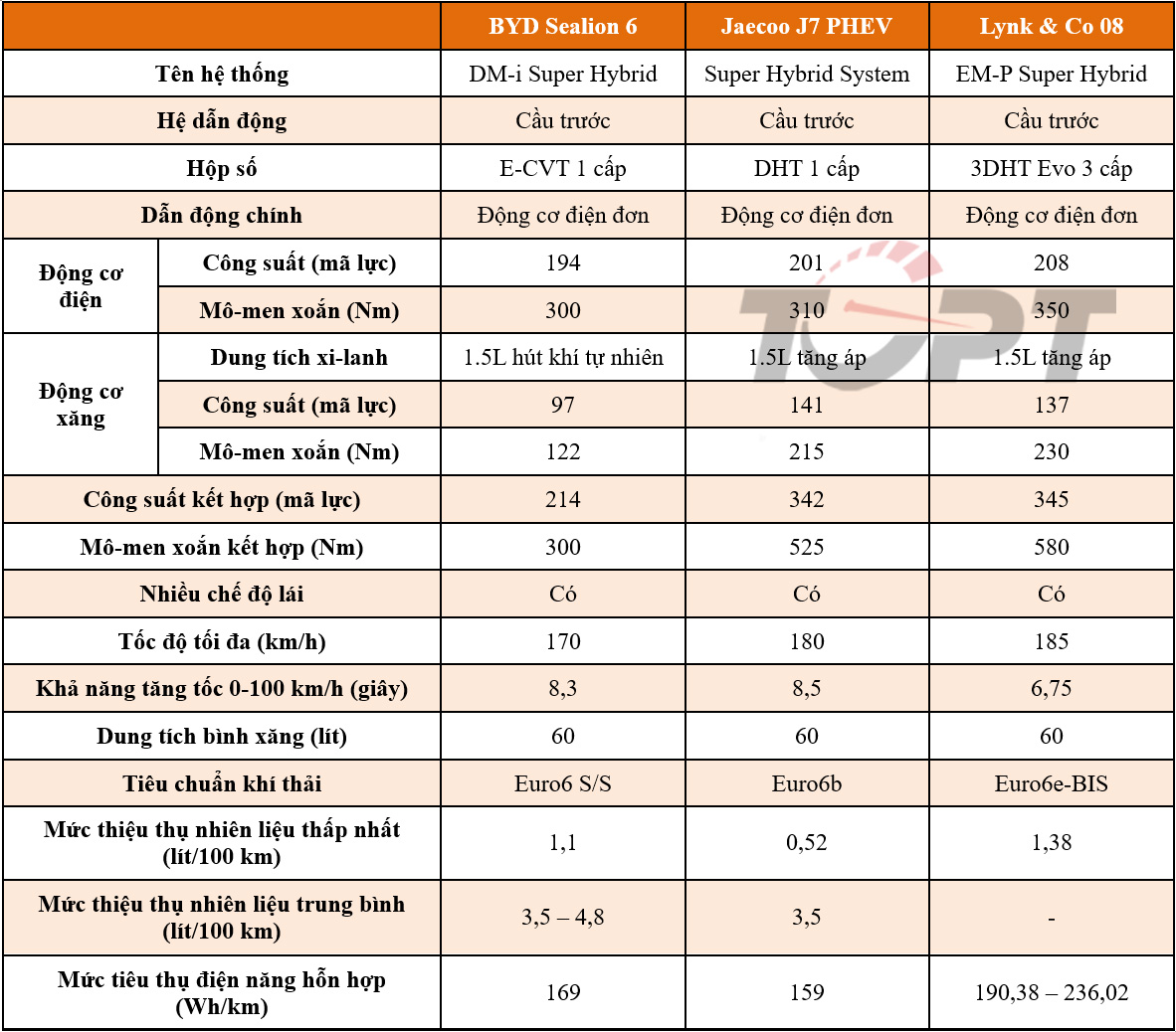 Cuối cùng, Lynk & Co 08 sử dụng hộp số 3DHT Evo 3 cấp thế hệ mới, kết hợp động cơ 1.5L tăng áp (137 mã lực, 230 Nm) cùng mô-tơ điện công suất 208 mã lực, cho tổng sức mạnh 345 mã lực và mô-men xoắn 580 Nm – mạnh nhất phân khúc. Nhờ đó, Lynk & Co 08 có thể tăng tốc từ 0–100 km/h chỉ trong 6,75 giây, nhanh hơn đáng kể so với BYD Sealion 6 và Jaecoo J7 PHEV.