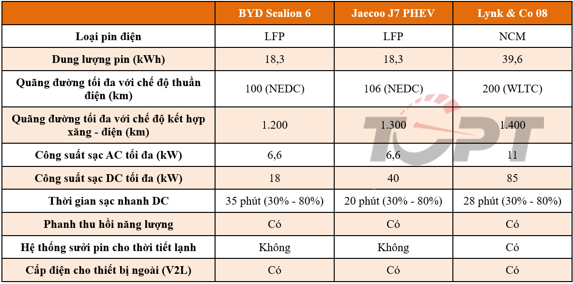 BYD Sealion 6, Jaecoo J7 và Lynk & Co 08 đang là ba đại diện Trung Quốc cùng sở hữu hệ thống PHEV với khả năng mở rộng phạm hoạt động thuần điện khá ấn tượng.