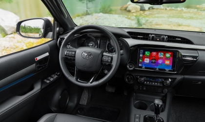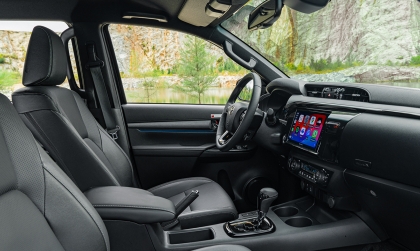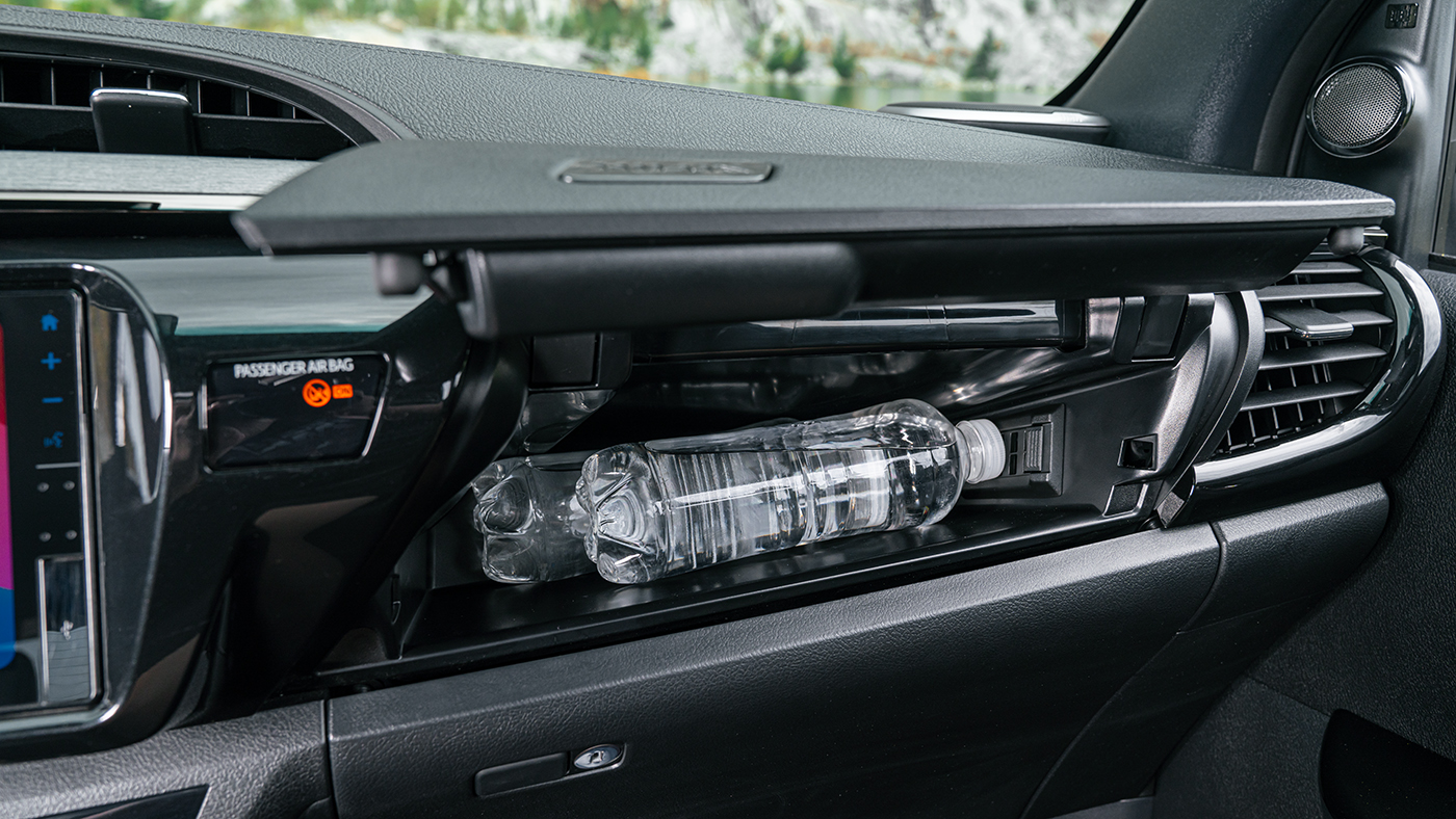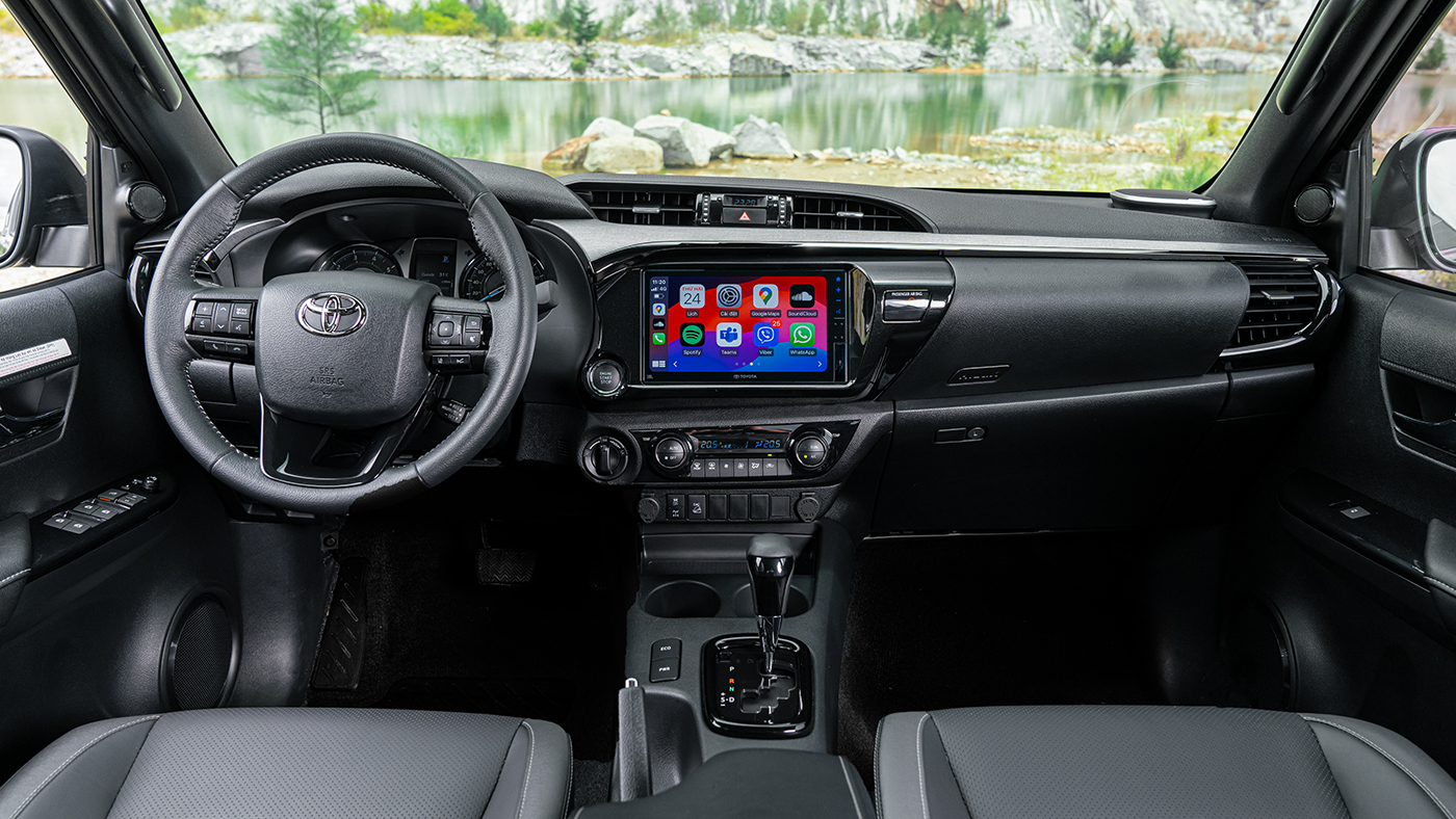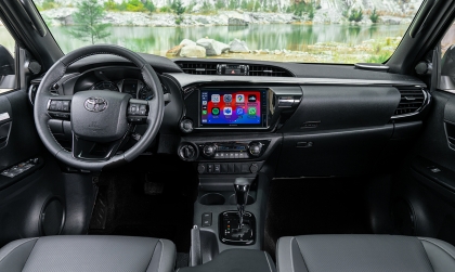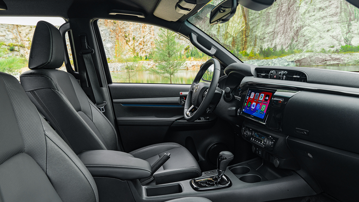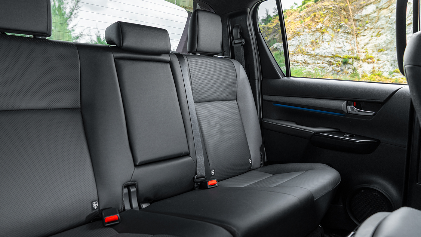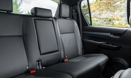 Khoang lái rộng rãi với thiết kế thể thao, hệ thống 9 loa JBL (1 loa siêu trầm), màn hình giải trí 9inch kết nối điện thoại thông minh không dây hay điều hòa tự động hai vùng độc lập (trên Hilux Adventure) góp phần nâng tầm trải nghiệm người dùng. Hilux là mẫu bán tải được đánh giá cao về khả năng cách âm, mang đến sự yên tĩnh cần thiết trong những hành trình dài. Nếu điểm yếu thường thấy của bán tải là hàng ghế thứ hai bị dốc lưng, dễ gây nhức mỏi khi đi đường dài thì ở Hilux, nhiều người dùng đánh giá ghế có độ ngả vừa phải, êm ái, khoảng cách với hàng ghế đầu cho phép để chân thoải mái.