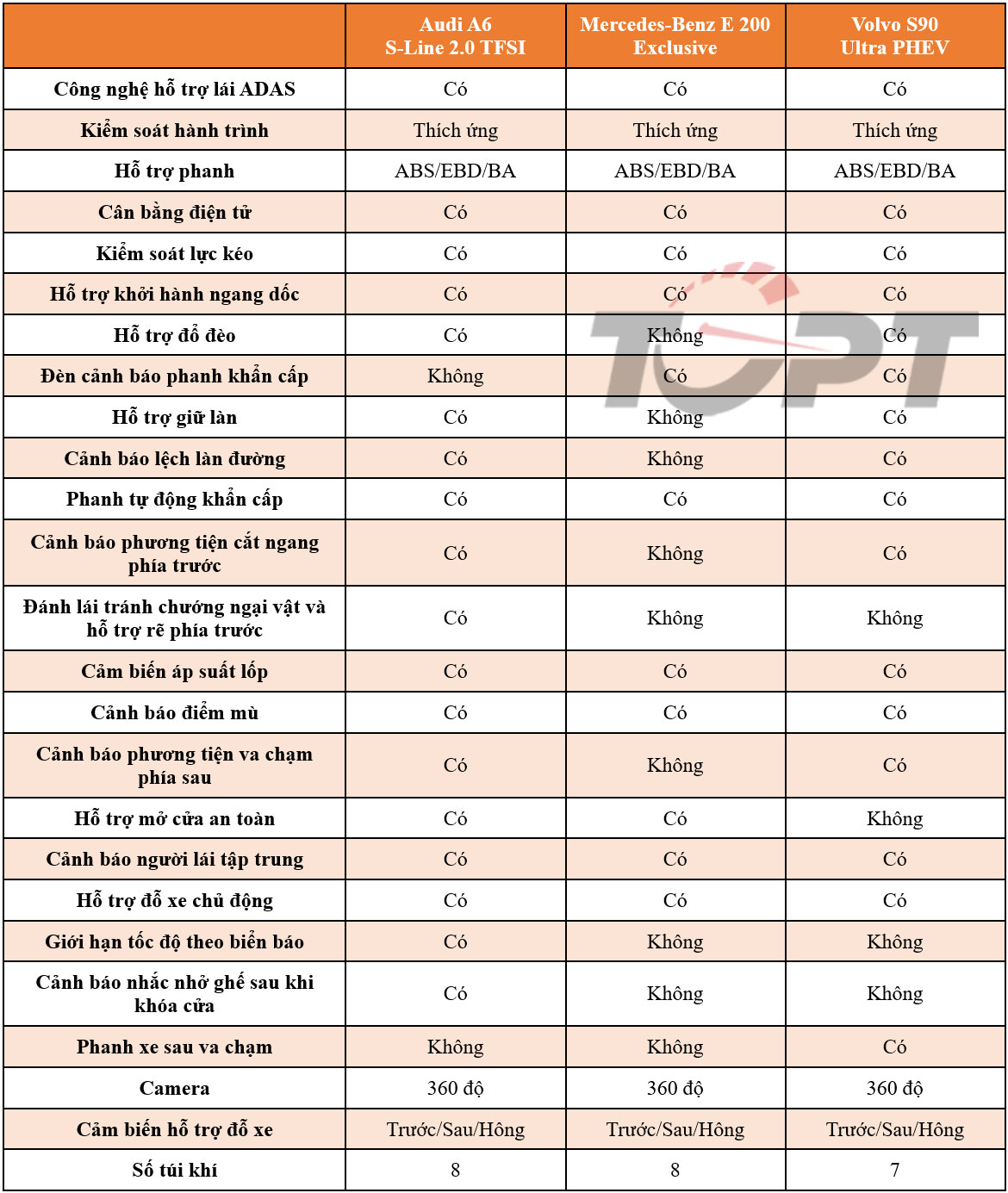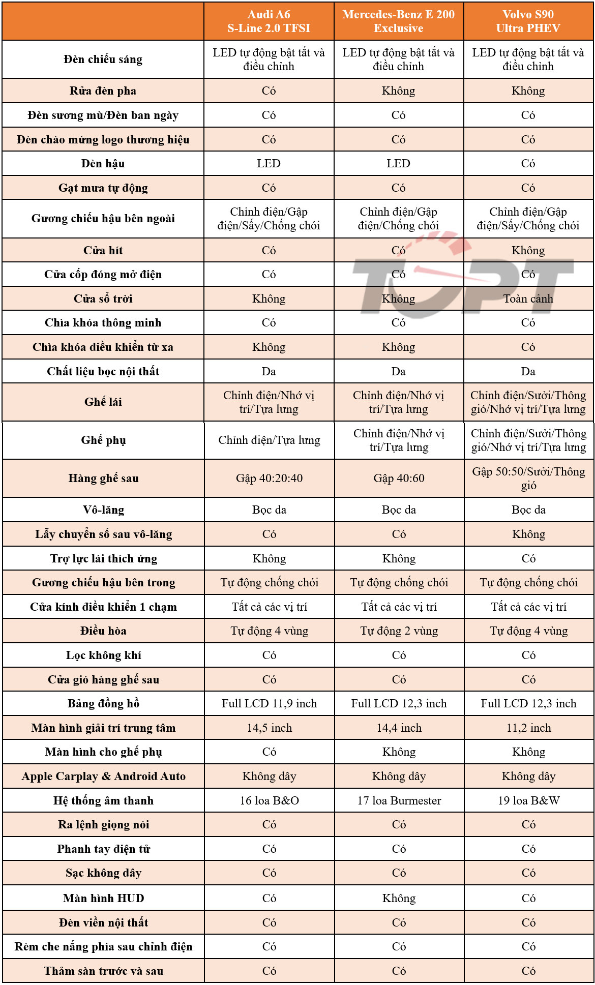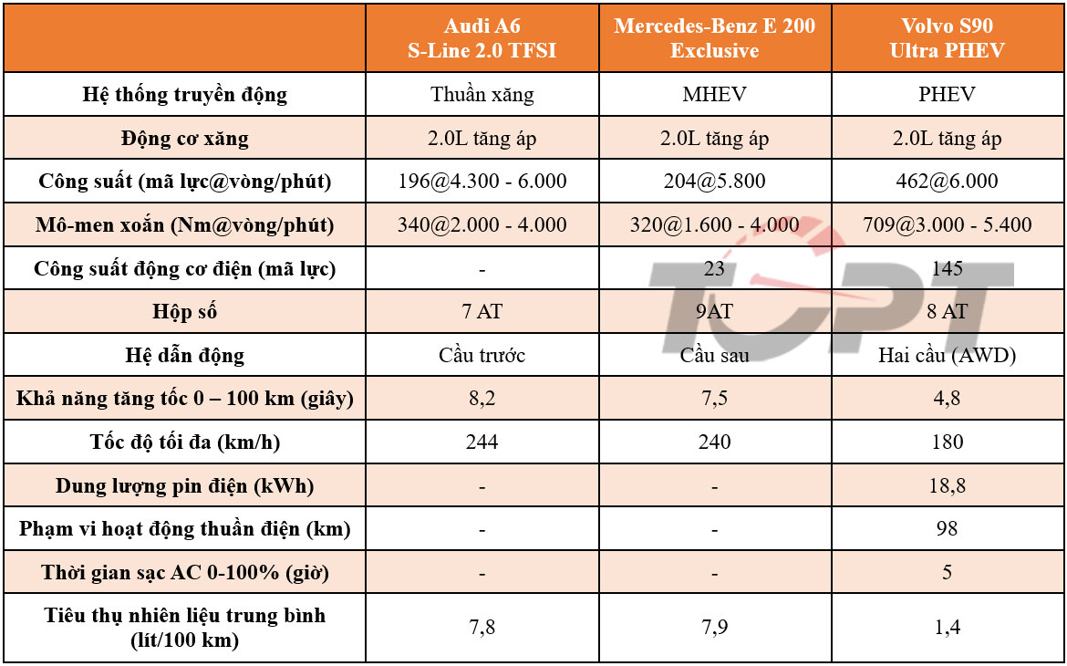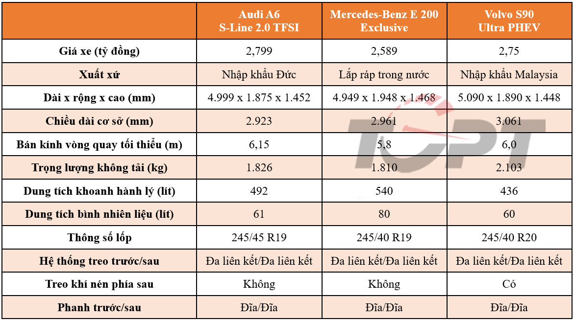 Hai mẫu xe Audi A6 và Volvo S90 mới chỉ được bán ra với duy nhất một phiên bản, nhưng có thể tùy chọn bổ sung trang bị; trong khi Mercedes-Benz E 200 Exclusive sẽ phù hợp nhất để so sánh về khả năng cạnh tranh cũng như đối tượng khách hàng hướng tới tại thị trường Việt Nam.