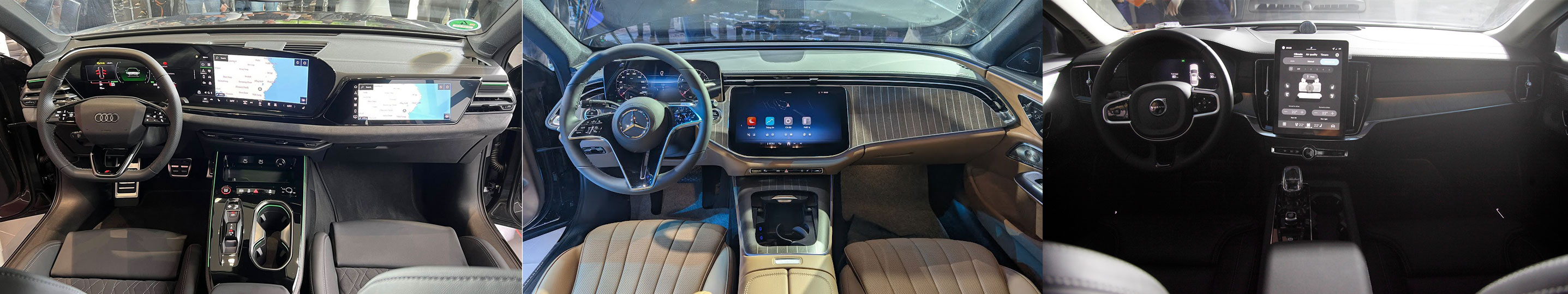 Trang bị tiện nghi tiếp tục là điểm mạnh của cả ba mẫu sedan hạng sang, nhưng mỗi mẫu lại có hướng tiếp cận khác nhau. Audi A6 gây ấn tượng với tính hiện đại nhờ màn hình phụ cho ghế hành khách, rửa đèn pha, màn hình hiển thị sau kính lái (HUD) và điều hòa 4 vùng, cùng với hệ thống âm thanh B&O. Mặt khác, Mercedes E 200 Exclusive duy trì phong cách sang trọng truyền thống hơn với hệ thống âm thanh Burmester và một số tính năng cao cấp hơn về mặt ghế ngồi, nhưng ngược lại - không bằng các đối thủ khi hệ thống điều hoà thiếu linh động và đề cao từng vị trí ghế ngồi như Audi A6 và Volvo S90.