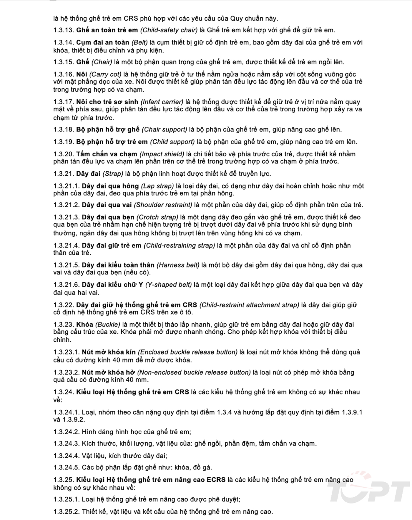 Hệ thống ghế trẻ em CRS là tổ hợp các bộ phận bao gồm ghế, dây đai, khóa an toàn, thiết bị điều chỉnh và các phụ kiện khác như nôi, tấm chắn va chạm; có khả năng lắp đặt chắc chắn lên xe ô tô.