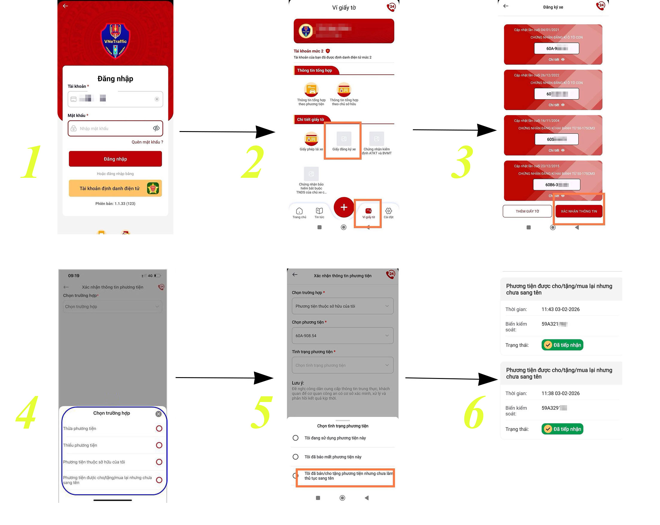 Với các trường hợp phương tiện từng thuộc sở hữu của người dân (vẫn đứng tên trên giấy đăng ký xe) đã bán, cho, tặng, chuyển quyền sở hữu nhưng chưa làm thủ tục thu hồi biển số hoặc bị mất cắp (nhưng chưa trình báo), người dân có thể sử dụng ứng dụng VNeTraffic (với tài khoản mức độ 2) để thực hiện các bước nhằm khai báo tình trạng phương tiện: