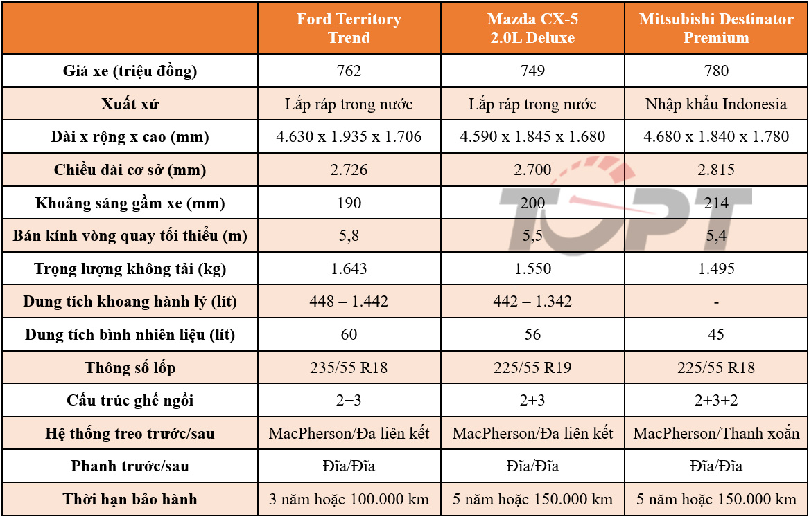 Về giá bán, Mazda CX-5 đang thấp nhất trong số ba mẫu xe này, việc lắp ráp trong nước hỗ trợ phần nào cho xe, và điều này cũng mang lại lợi thế giá tương tự cho Ford Territory. Trong khi đó, Mitsubishi Destinator nhập khẩu từ Indonesia với chất lượng có thể tốt hơn nhưng sẽ gặp một số bất lợi về nguồn cung và giá sẽ cao hơn khá nhiều.