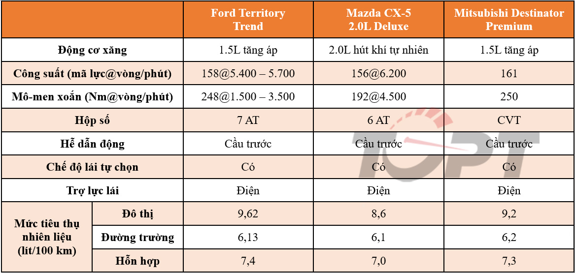 Hiện cả Ford Territory và Mitsubishi Destinator đều được trang bị động cơ 1.5L tăng áp, trong khi Mazda CX-5 sử dụng động cơ 2.0L hút khí tự nhiên quen thuộc. Sức mạnh không quá chênh lệch nhưng mức tiêu thụ nhiên liệu của mẫu xe Mazda đang tốt nhất phân khúc này, với mức trung bình 7 lít/100 km.