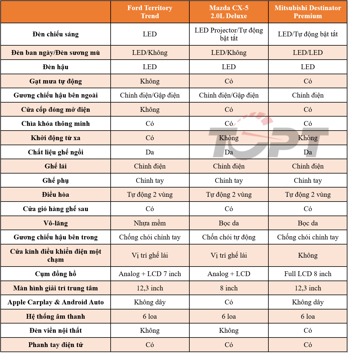 Mặc dù chênh lệch giá không quá lớn, trang bị tiện nghi trên ba mẫu xe lại có sự khác biệt đáng kể. Ford Territory tạo lợi thế nhờ màn hình giải trí 12,3 inch, lớn tương đương Destinator và vượt trội CX-5 (8 inch) và trang bị khởi động từ xa – tính năng hai mẫu còn lại không có.