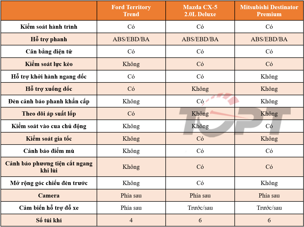 Về an toàn, Mazda CX-5 nổi bật nhất nhờ trang bị sẵn một số hệ thống an toàn hiện đại hơn, gồm: Kiểm soát lực kéo, cảnh báo điểm mù, cảnh báo phương tiện cắt ngang khi lùi, mở rộng góc chiếu đèn trước. Trong khi đó, Mitsubishi Destinator sở hữu duy nhất tính năng vượt trội, đó là hệ thống kiểm soát vào cua chủ động đặc trưng của hãng xe Nhật.