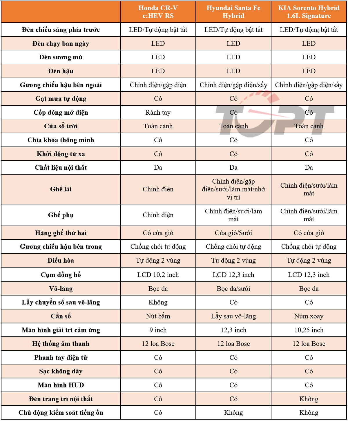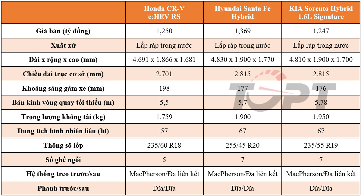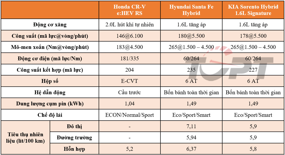Cả ba mẫu xe đều thể hiện rõ định hướng riêng nhằm chinh phục các tệp khách hàng khác nhau. KIA Sorento Hybrid 1.6L Signature sẽ phù hợp cho khách hàng muốn tối ưu về giá bán cùng với công năng sử dụng. Trong khi đó, Honda CR-V e:HEV RS sẽ mang lại trải nghiệm tốt cùng mức tiêu hao nhiên liệu tối ưu nhất.