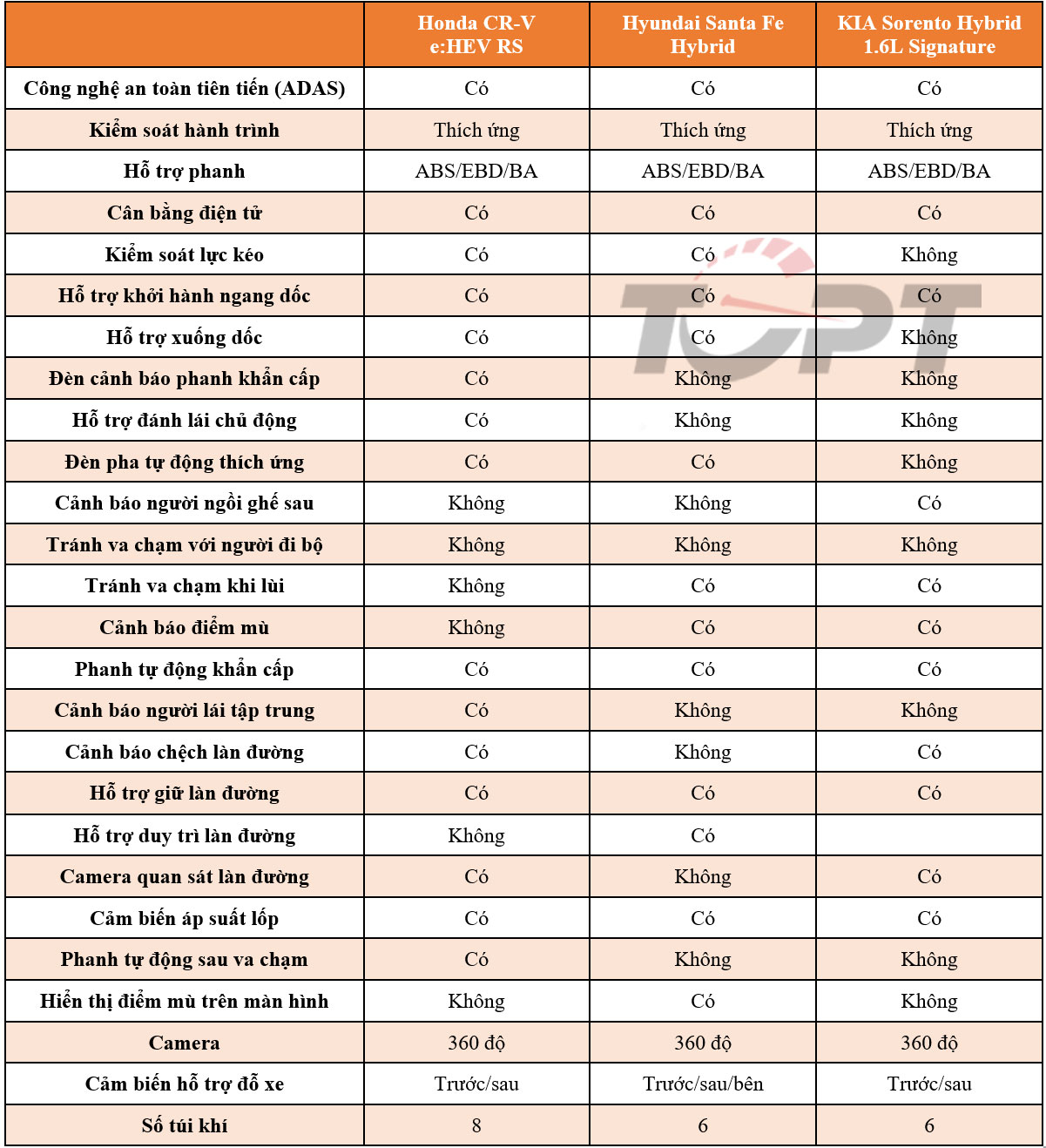 Trong đó, Honda CR-V cung cấp số lượng túi khí nhiều nhất, cùng với các tính năng độc quyền trong nhóm như cảnh báo người lái tập trung và phanh tự động sau va chạm. Hyundai Santa Fe có khá nhiều tính năng mới lạ và vượt trội hơn so với Honda CR-V, trong khi KIA Sorento khó có thể gây ấn tượng về mặt an toàn với số lượng tính năng ít hơn nhiều so với hai đối thủ.