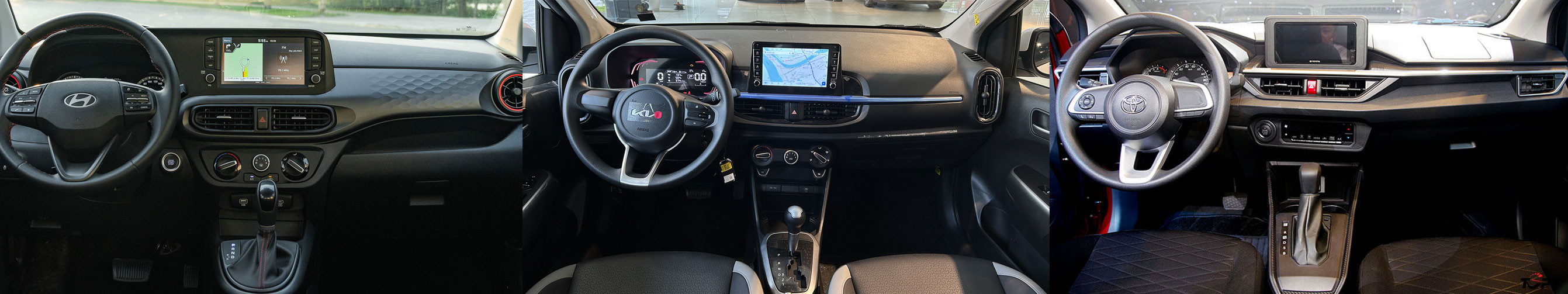 Trong khoang cabin, Hyundai Grand i10 1.2AT cũng cho thấy sự vượt trội, đặc biệt là vô-lăng bọc da, có thêm cửa gió điều hòa và cổng sạc USB cho hàng ghế sau. KIA Morning khá nổi bật với hệ thống ghế da, kết nối Apple CarPlay và Android Auto không dây, nhưng chìa khóa xe không tích hợp tính năng đề nổ bằng nút bấm.