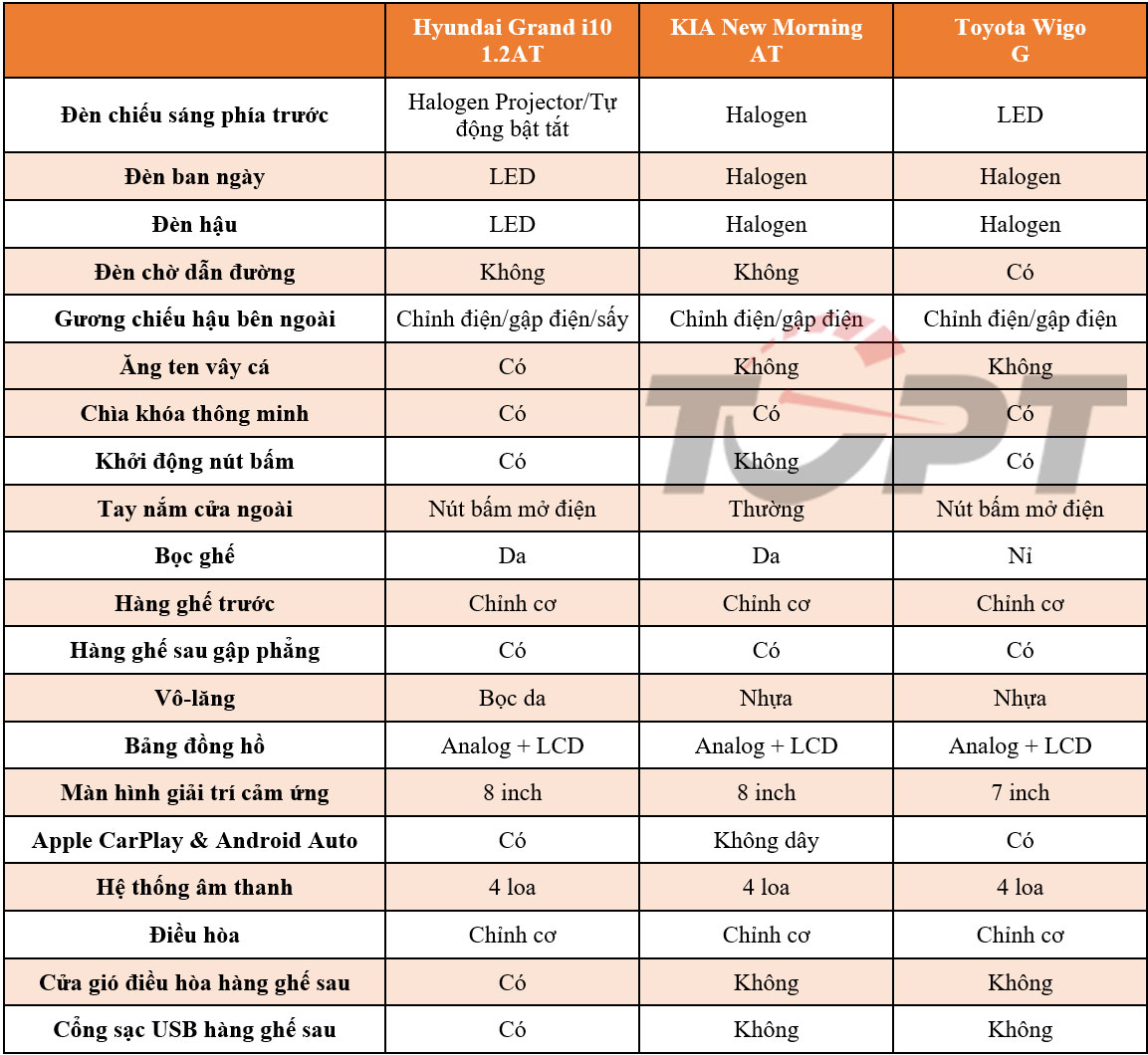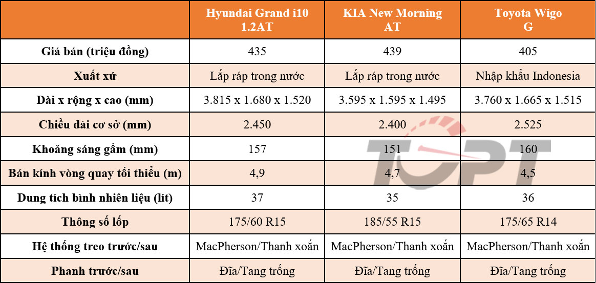 Trong phân khúc này, sự lựa chọn của khách hàng rất dễ với Hyundai Grand i10 sẽ phù hợp cho nhu cầu trải nghiệm tiện nghi, không gian rộng rãi trong khoang cabin; Toyota Wigo sẽ dành cho người dùng ưu tiên sự an toàn cùng với sự bên bỉ và tiết kiệm chi phí sử dụng.