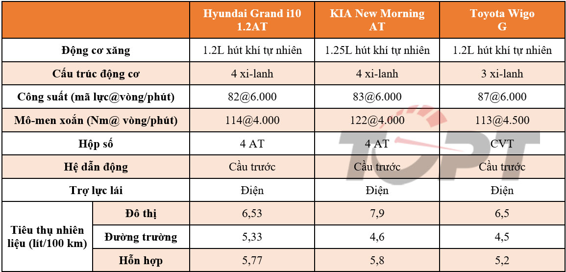 Sức mạnh của các mẫu xe hatchback khá tương đồng nhưng Toyota Wigo cho công suất tối đa cao nhất trong khi mô-men xoắn lại thấp nhất, cùng với hộp số biến thiên vô cấp CVT duy nhất trong phân khúc. Tuy nhiên, xe sở hữu cấu trúc 3 xi-lanh sẽ không mang lại sự ổn định so với hai đối thủ.