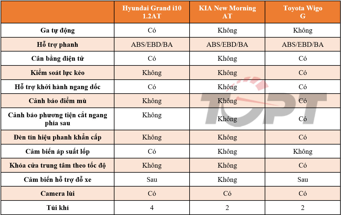 Trong khi đó, Hyundai Grand i10 1.2AT lại khác biệt khi là mẫu xe duy nhất sở hữu hệ thống ga tự động (Cruise Control) và tích hợp sẵn cảm biến áp suất lốp, cùng với 4 túi khí có sẵn. Trong khi đó, KIA Morning AT đang kém hơn khá nhiều so với hai đối thủ về mặt an toàn với số lượng ít trang bị cơ bản.