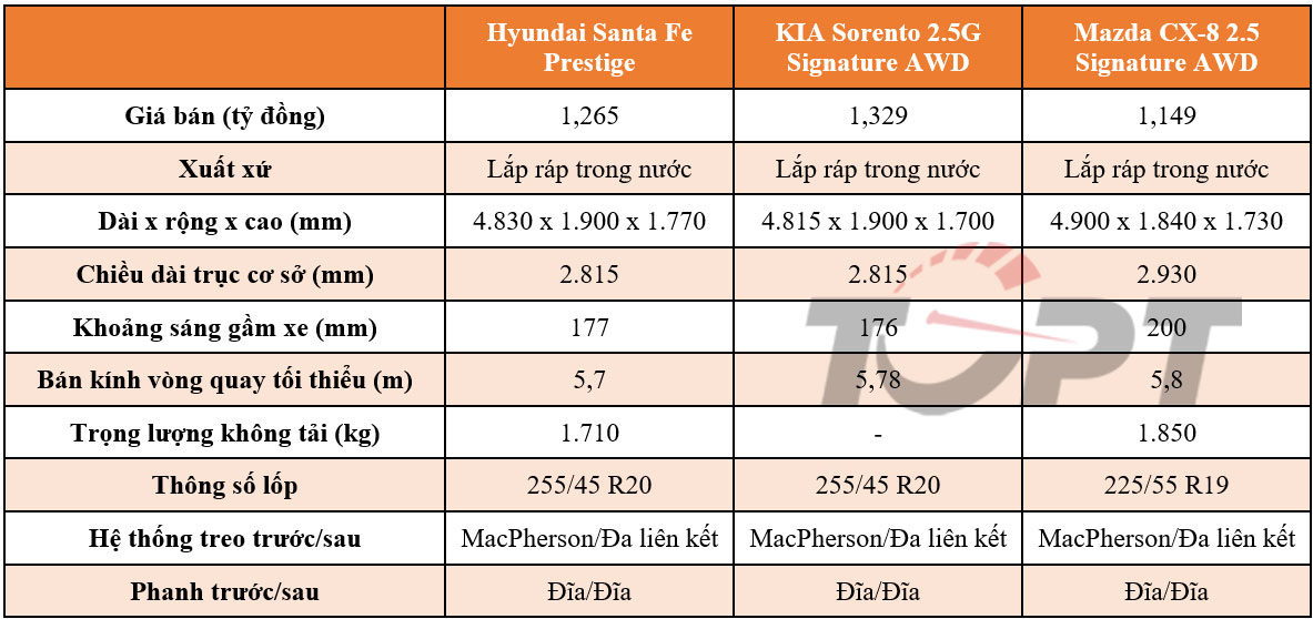 KIA Sorento là mẫu xe được nâng cấp mới nhất nhưng chỉ được bán ra với hai phiên bản với tùy chọn động cơ xăng và dầu diesel, cùng với gói nâng cấp hệ thống dẫn động bốn bánh (AWD). Nhằm có được sự cân bằng khi so sánh, phiên bản 2.5G Signature AWD với động cơ xăng sẽ là lựa chọn phù hợp để cạnh tranh với hai đối thủ Hyundai Santa Fe Prestige và Mazda CX-8 2.5 Signature AWD.