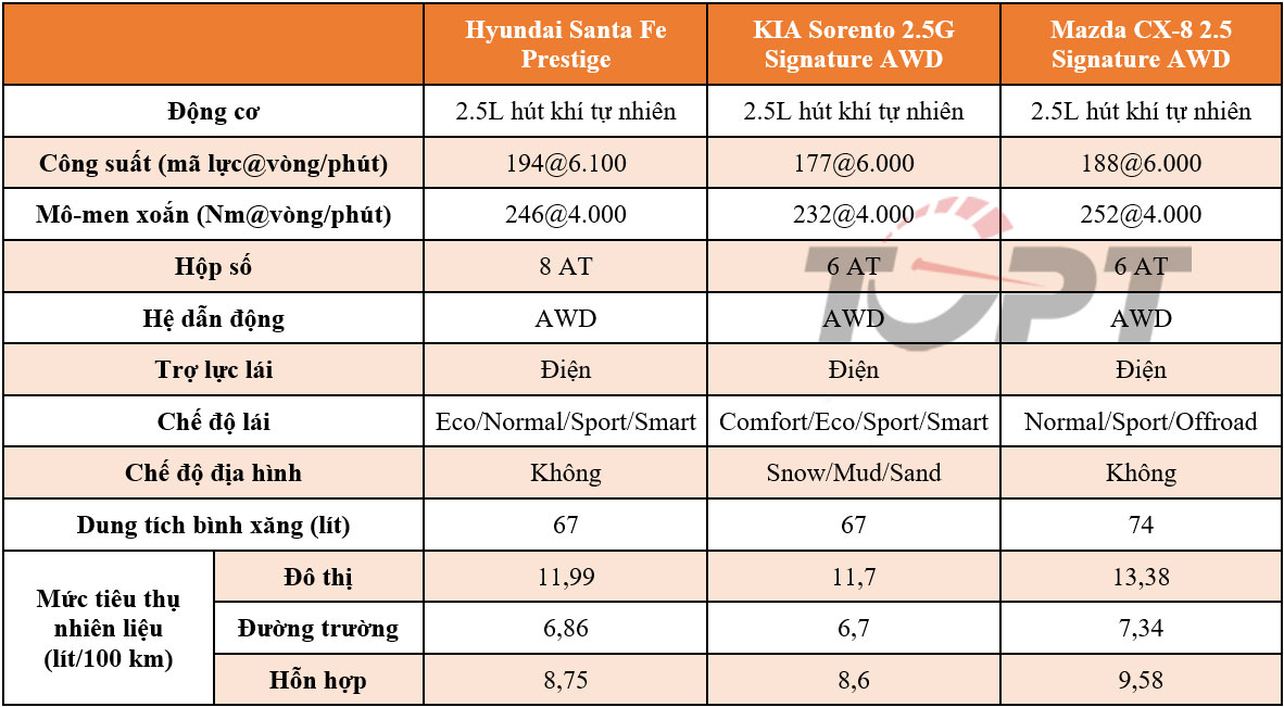 Các xe này đều sử dụng động cơ 2.5L hút khí tự nhiên, đặc biệt là Hyundai Santa Fe và KIA Sorento vốn có tương đồng về cụm máy. Tuy nhiên, sức mạnh của mỗi xe lại có khác biệt, đại diện Hyundai mang lại công suất cao nhất (kết hợp với hộp số tự động 8 cấp), Mazda CX-8 lại cho mô-men xoắn mạnh nhất.