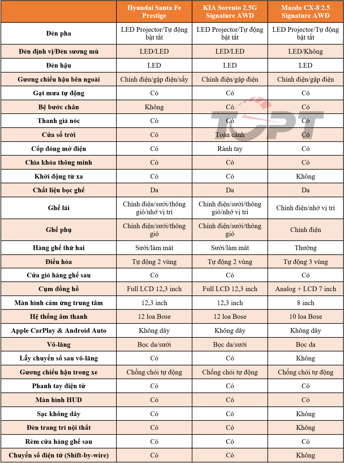 Hyundai Santa Fe cũng sở hữu lượng trang bị gần như tương đương với "người anh em", dù thiếu hai tiện nghi như trên nhưng xe được bổ sung chức năng sấy gương chiếu hậu bên ngoài. Trong khi đó, Mazda CX-8 2.5 Signature AWD bị cắt giảm khá nhiều trang bị để tối ưu chi phí và giá bán cho khách hàng Việt Nam.
