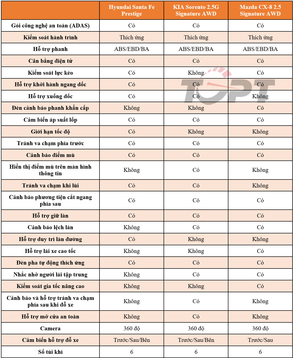 Theo xu hướng tiết kiệm chi phí, Mazda CX-8 sở hữu số lượng tính năng an toàn ít nhất và yêu cầu người điều khiển phải chủ động xử lý nhiều hơn, nhưng vẫn đủ dùng cho khách hàng trong đa số các tình huống trên đường. Mặt khác, KIA Sorento 2.5G Signature AWD được trang bị đầy đủ nhất, nhưng không quá vượt trội so với Hyundai Santa Fe Prestige.