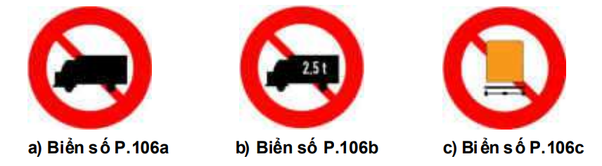 Để báo đường cấm các loại xe ôtô tải có khối lượng chuyên chở (theo Giấy chứng nhận kiểm định an toàn kỹ thuật và bảo vệ môi trường phương tiện giao thông cơ giới đường bộ) lớn hơn một giá trị nhất định, đặt biển số P.106b. Biển có hiệu lực cấm các xe ôtô tải có khối lượng chuyên chở (xác định theo Giấy chứng nhận kiểm định an toàn kỹ thuật và bảo vệ môi trường phương tiện giao thông cơ giới đường bộ) lớn hơn giá trị chữ số ghi trong biển (chữ số tấn ghi bằng màu trắng trên hình vẽ xe). Biển có hiệu lực cấm đối với cả máy kéo và các xe máy chuyên dùng đi vào đoạn đường đặt biển.