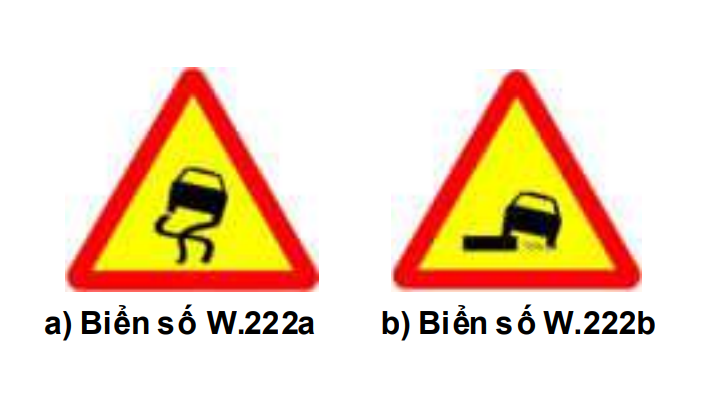 - Để báo những nơi lề đường không ổn định, khi xe đi vào dễ gây văng đất đá hoặc bánh xe quay tại chỗ, đặt biển số W.222b "Lề đường nguy hiểm".