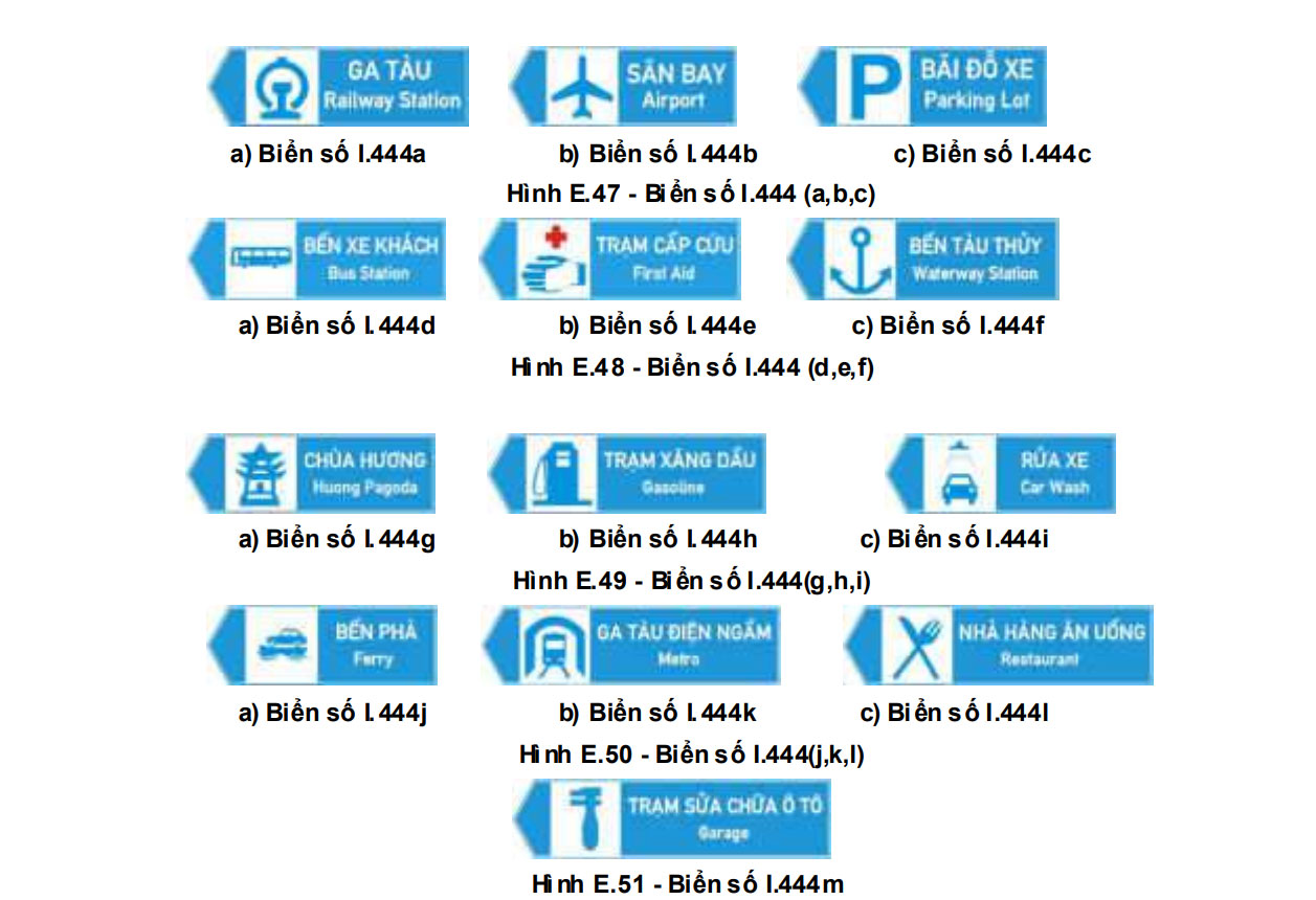 - Biển chỉ dẫn khu vực dịch vụ cho khách đi đường (biển số I.444l) đặt biển ở trước nơi đường giao nhau với đường vào trạm dừng nghỉ;
