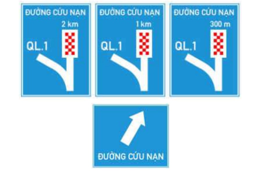 - Biển chỉ dẫn gồm 4 cặp biển ở các cự ly 2 km, 1 km, 300 m và tại chỗ rẽ nhằm chỉ dẫn cho người tham gia giao thông biết vị trí và khoảng cách có làn cứu nạn. Vị trí biển đặt ở vị trí thuận lợi, dễ quan sát, cự ly có thể điều chỉnh cho phù hợp.