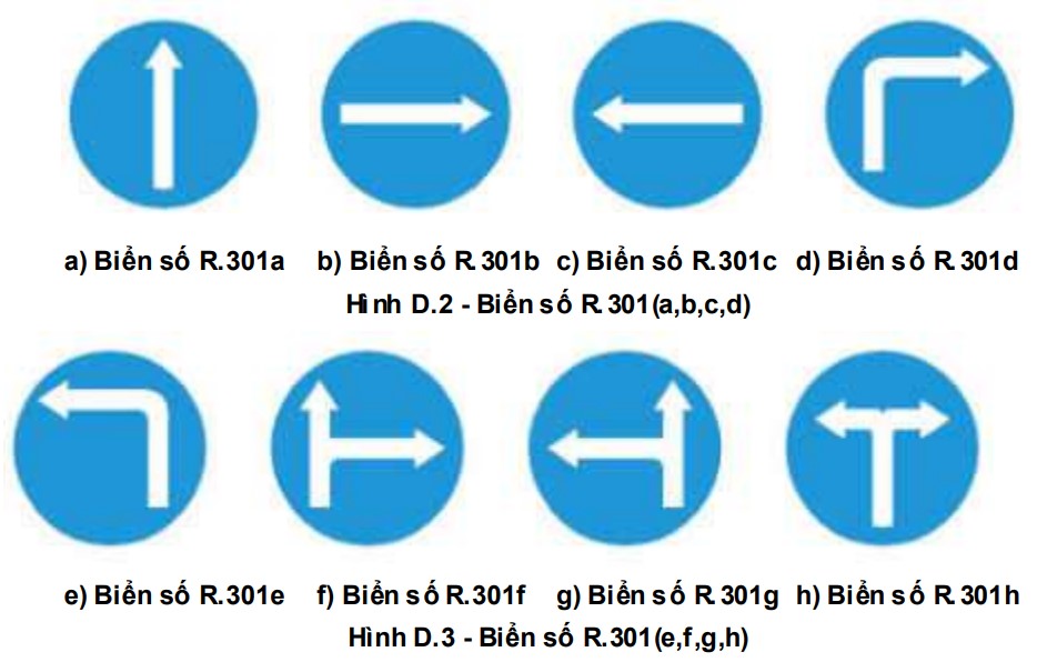Biển số R.301 dùng để: Báo cho các loại xe (thô sơ và cơ giới) phải đi theo hướng quy định, đặt một trong những kiểu biển số R.301 (a,b,c,d,e,f,g,h) "Hướng đi phải th eo". Tùy theo hướng đi mà chọn kiểu biển cho phù hợp.