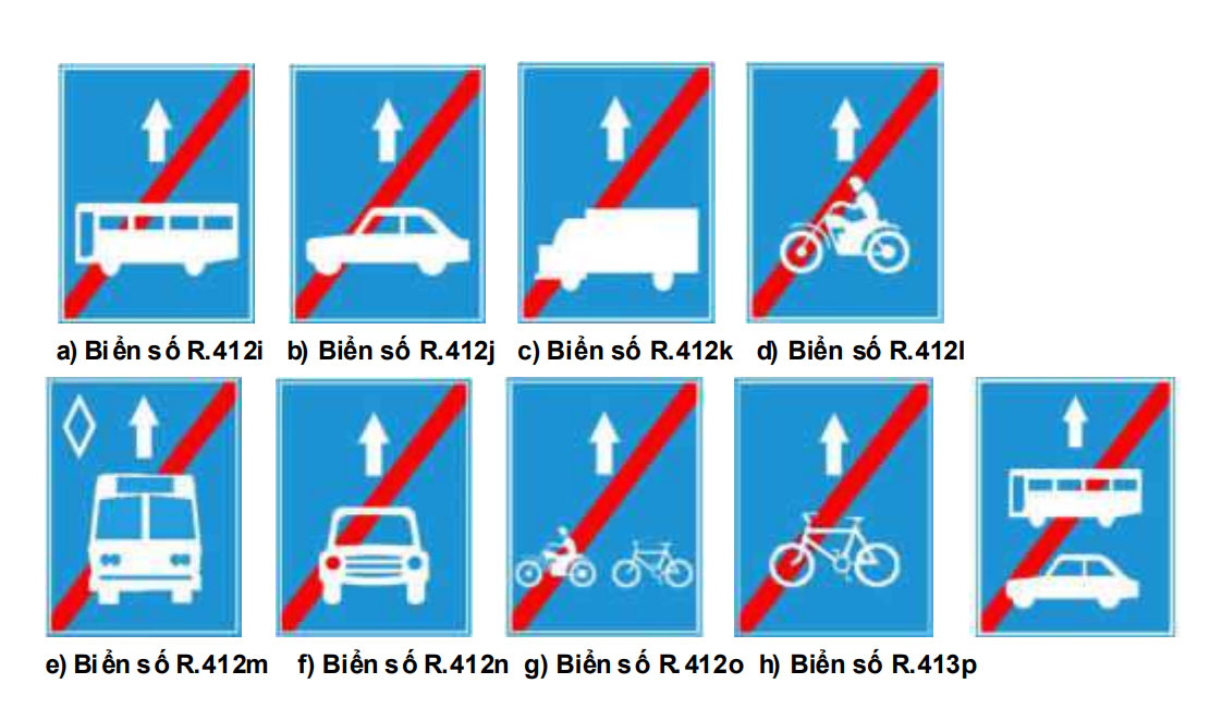 Biển số R. 412 (i,j,k,l,m,n,o,p) dùng để: Báo hiệu kết thúc làn đường dành riêng cho từng loại xe hoặc nhóm xe riêng biệt.