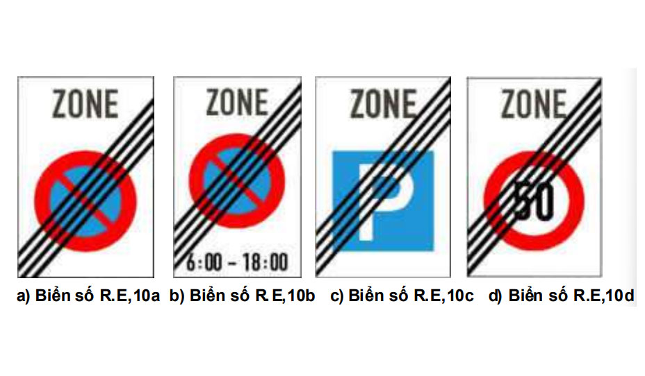 - Để báo hiệu hết cấm đỗ xe trong khu vực, đặt biển số R.E,10a “Hết cấm đỗ xe trong khu vực”;