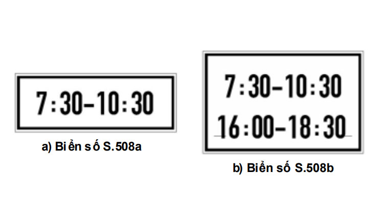 - Biển số S.508 (a,b) được đặt dưới biển báo cấm hoặc biển hiệu lệnh nhằm quy định phạm vi thời gian hiệu lực của các biển báo cấm, biển hiệu lệnh cho phù hợp yêu cầu.