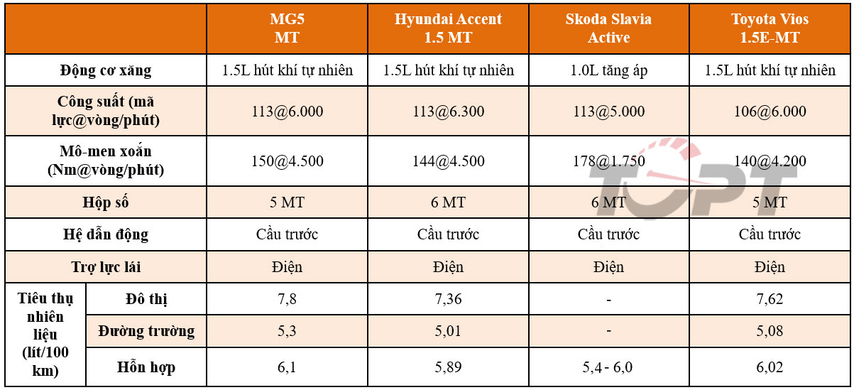Điểm chung của các sedan trong bảng so sánh là đều sử dụng hộp số sàn (5 hoặc 6 cấp), cùng với hệ dẫn động cầu trước và trợ lực lái điện. Theo công bố của nhà sản xuất, Hyundai Accent MT đang có khả năng tiết kiệm cao nhất so với các đối thủ trong phân khúc.