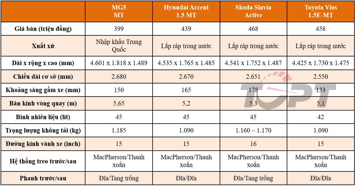 Trong số bốn mẫu xe này, MG5 MT có giá bán rẻ nhất và là đại diện duy nhất được nhập khẩu từ nước ngoài. Cùng với đó, xe cũng có kích thước khá lớn trong phân khúc, cung cấp không gian rộng rãi bên trong. Skoda Slavia có giá bán đắt nhất, ưu thế của xe nằm ở khoảng sáng gầm và bánh mâm 16 inch.