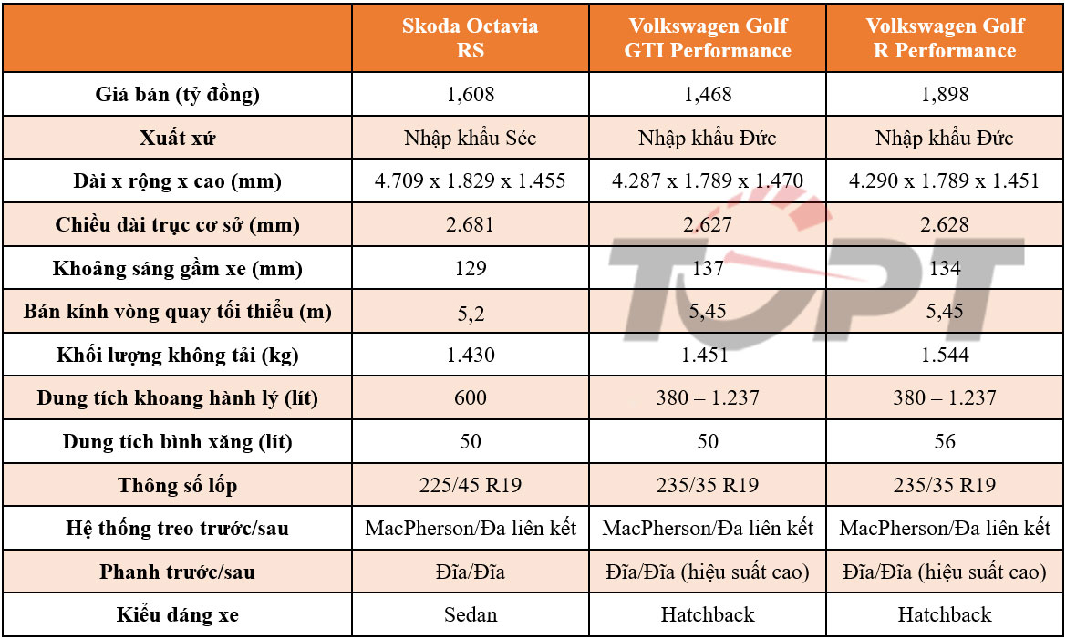 Sự khác biệt lớn nhất giữa các mẫu xe thể hiện rõ ở thông số kích thước do sở hữu kiểu dáng thân xe khác biệt. Skoda Octavia RS sở hữu chiều dài vượt trội hơn hẳn, nhưng các kích thước còn lại không chênh lệch quá nhiều. Đặc biệt, trọng lượng không tải của Volkswagen Golf GTI Performance và R Performance có phần vượt trội hơn, cùng với đó là khả năng mở rộng khoang hành lý linh hoạt.