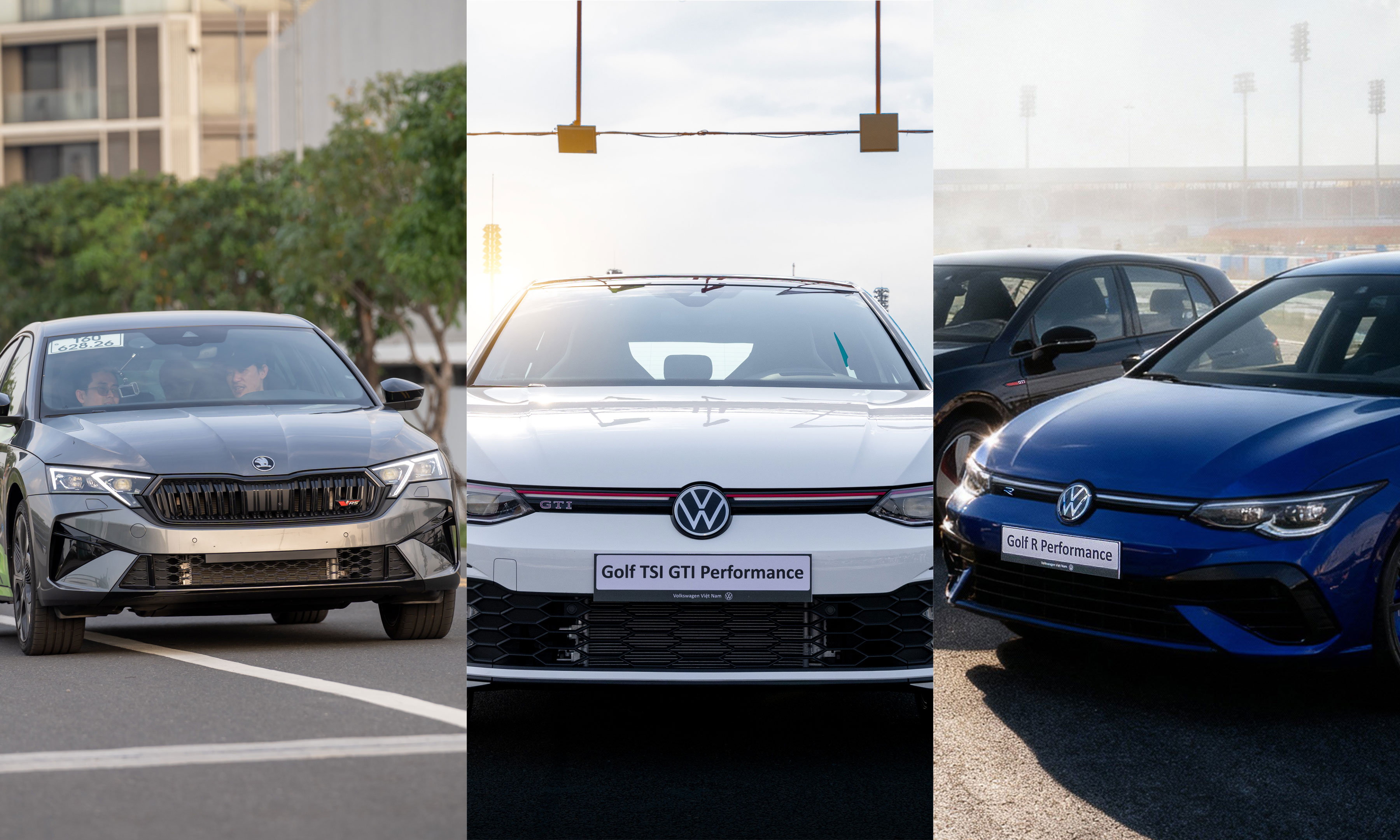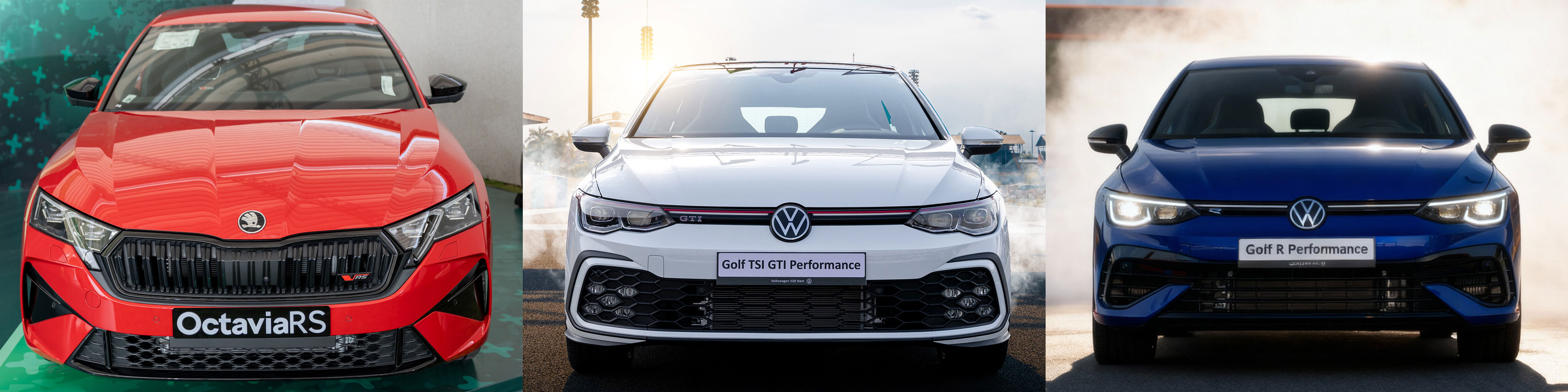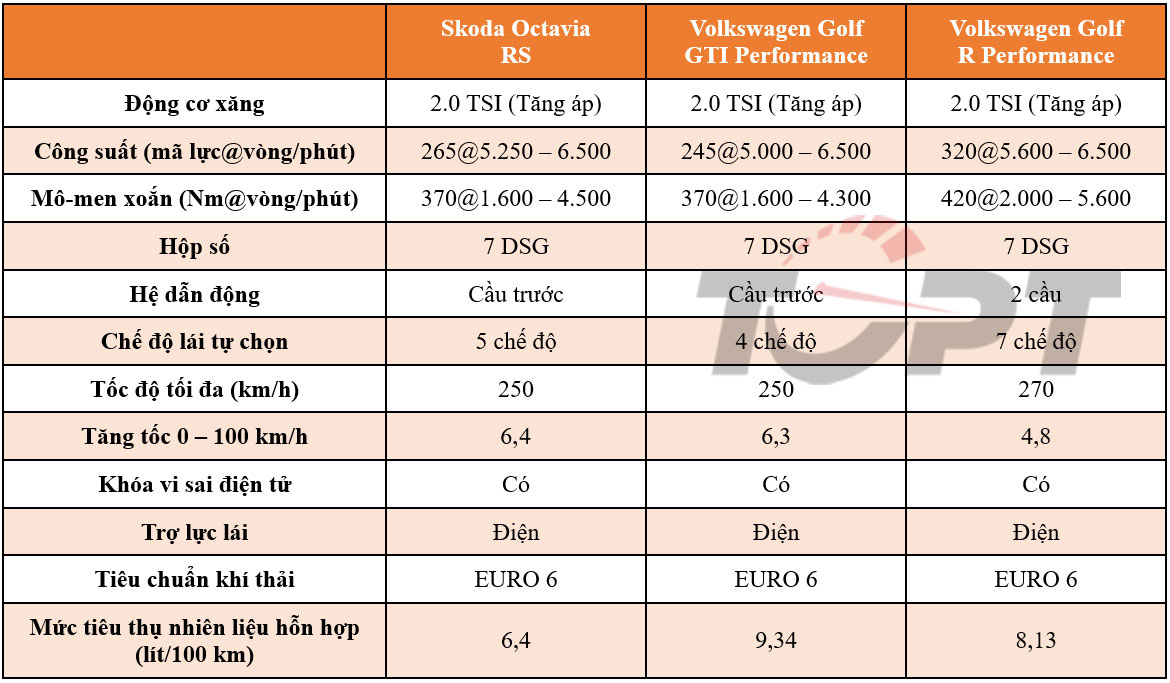 Trong ba mẫu xe, nếu như Octavi RS và Golf GTI đều sử dụng động cơ xăng 2.0 TSI tăng áp, kết hợp hộp số 7 cấp DSG và hệ dẫn động cầu trước thì Volkswagen Golf R khác biệt hơn với sức mạnh vượt trội hơn, kết hợp với hệ dẫn động 4 bánh 4Motion và 7 chế độ lái tự chọn, cho thời gian tăng tốc 0 - 100 km/h chỉ với 4,8 giây.