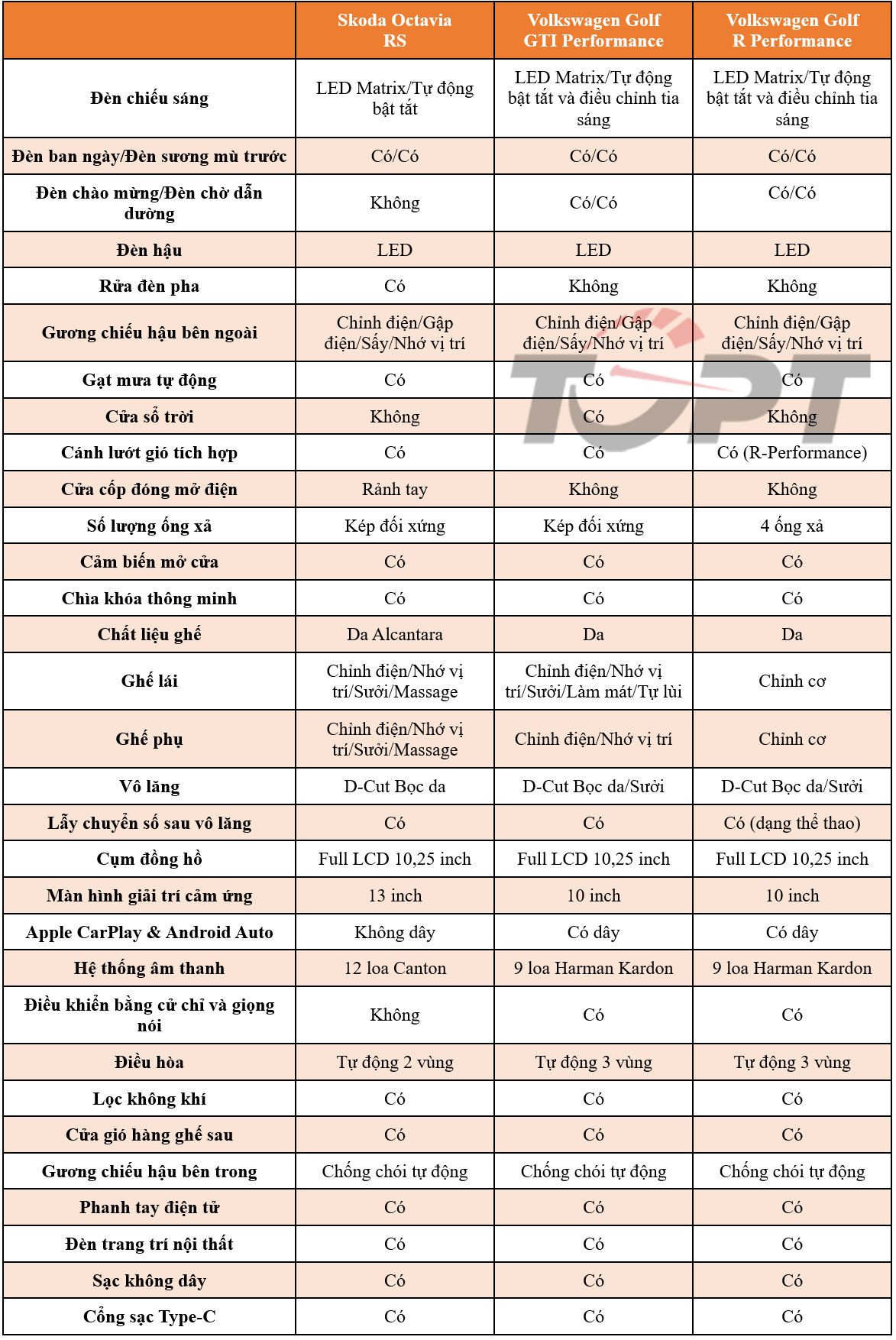 Về trang bị ngoại thất, trong khi Golf GTI Performance và R Performance khá tương đồng, với đèn chiếu sáng có khả năng điều chỉnh tia sáng chủ động. Tuy nhiên, phiên bản cao cấp nhất sở hữu một số trang bị đặc trưng thể hiện tính thể thao. Đáng chú ý khi Skoda Octavia sở hữu tính năng rửa đèn pha và cốp điện rảnh tay tiện dụng hơn so với hai mẫu xe Volkswagen.