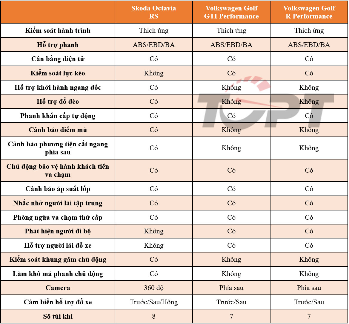 Volkswagen Golf GTI Performance và R Performance rất đồng bộ về hệ thống an toàn khi có 7 túi khí, camera lùi, cảm biến trước/sau, bù lại có thêm tính năng hỗ trợ đỗ xe cho người lái và phát hiện người đi bộ – những trang bị không có trên Octavia RS. Cả hai đều có kiểm soát hành trình thích ứng, phanh khẩn cấp tự động và các hệ thống an toàn cơ bản.