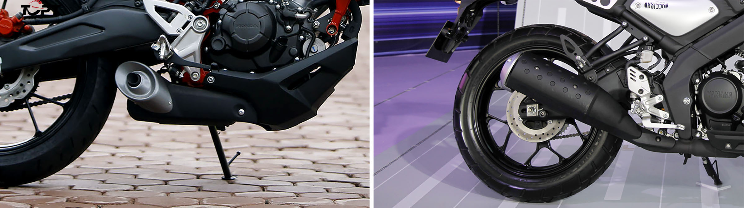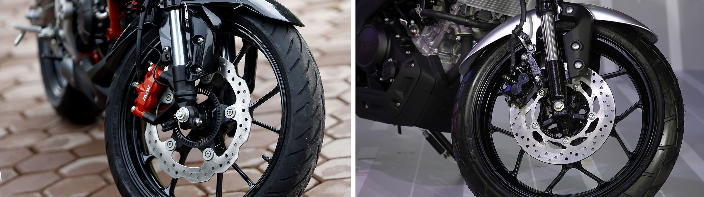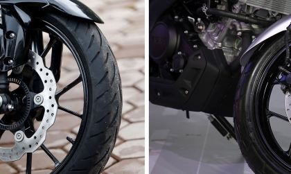Cả hai mẫu xe này đều dùng cỡ vành 17 inch (cả trước/sau) và lốp trước có cùng thông số 110/70, tuy nhiên Honda CB150R có lốp sau 150/60 (dùng Dunlop-Sportmax) to bản hơn một chút so với Yamaha XS155R (dùng lốp IRC – Trailwinner) là 140/70. Tuy nhiên nếu nhìn về dòng lốp và vì sau thành lốp của Yamaha XS155R lại lớn hơn là do mẫu xe này thích ứng các loại đường xấu hơn so với đối thủ Honda.