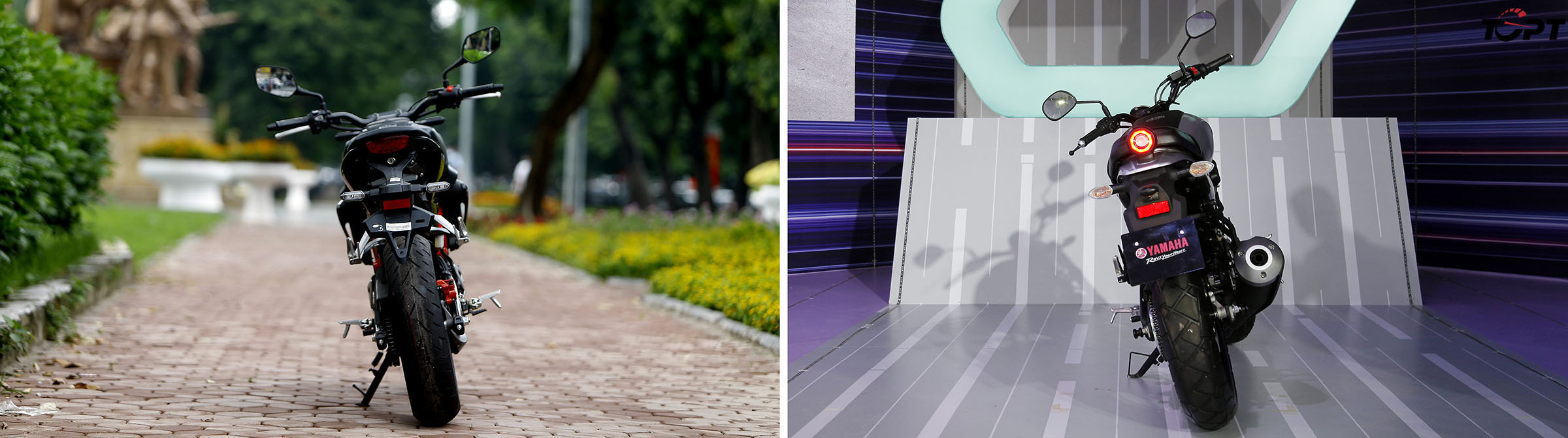 Thiết kế cụm đèn hậu của Yamaha XSR155R cá tính hơn hẳn so với đối thủ CB150R Streetster, tương đồng với thiết kế đèn pha (và cả cụm đồng hồ LCD)...