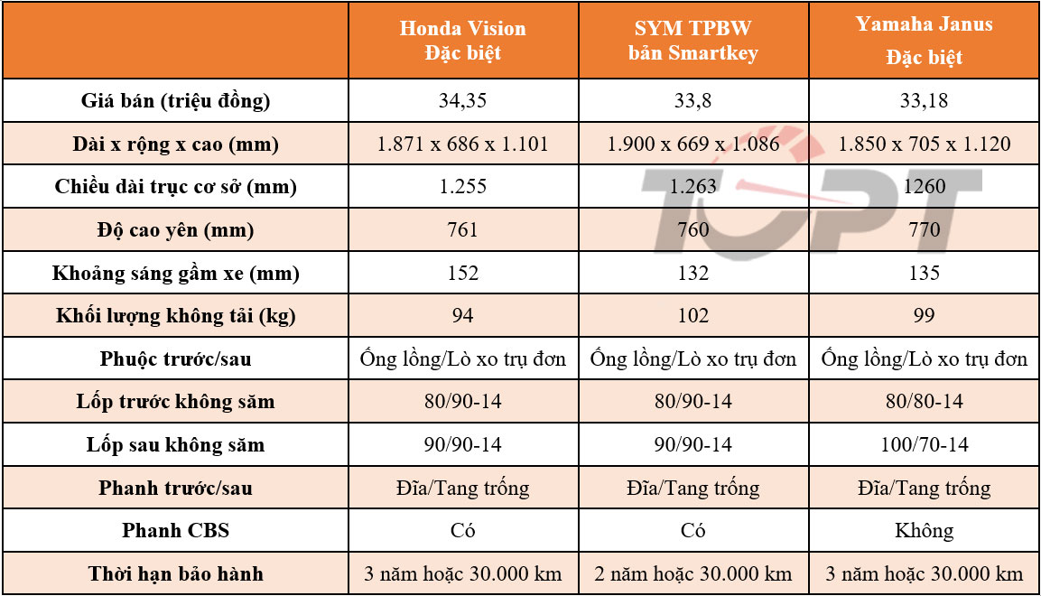 Tuy nhiên, Honda Vision và Yamaha Janus cùng có chính sách bảo hành 3 năm hoặc 30.000 km tùy điều kiện nào đến trước, trong khi SYM TPBW chỉ tối đa 2 năm hoặc 30.000 km, điều này khiến ảnh hưởng đến sự lựa chọn của người tiêu dùng đặc biệt khi xe SYM chưa thể cạnh tranh với Honda và Yamaha về sức nặng thương hiệu.