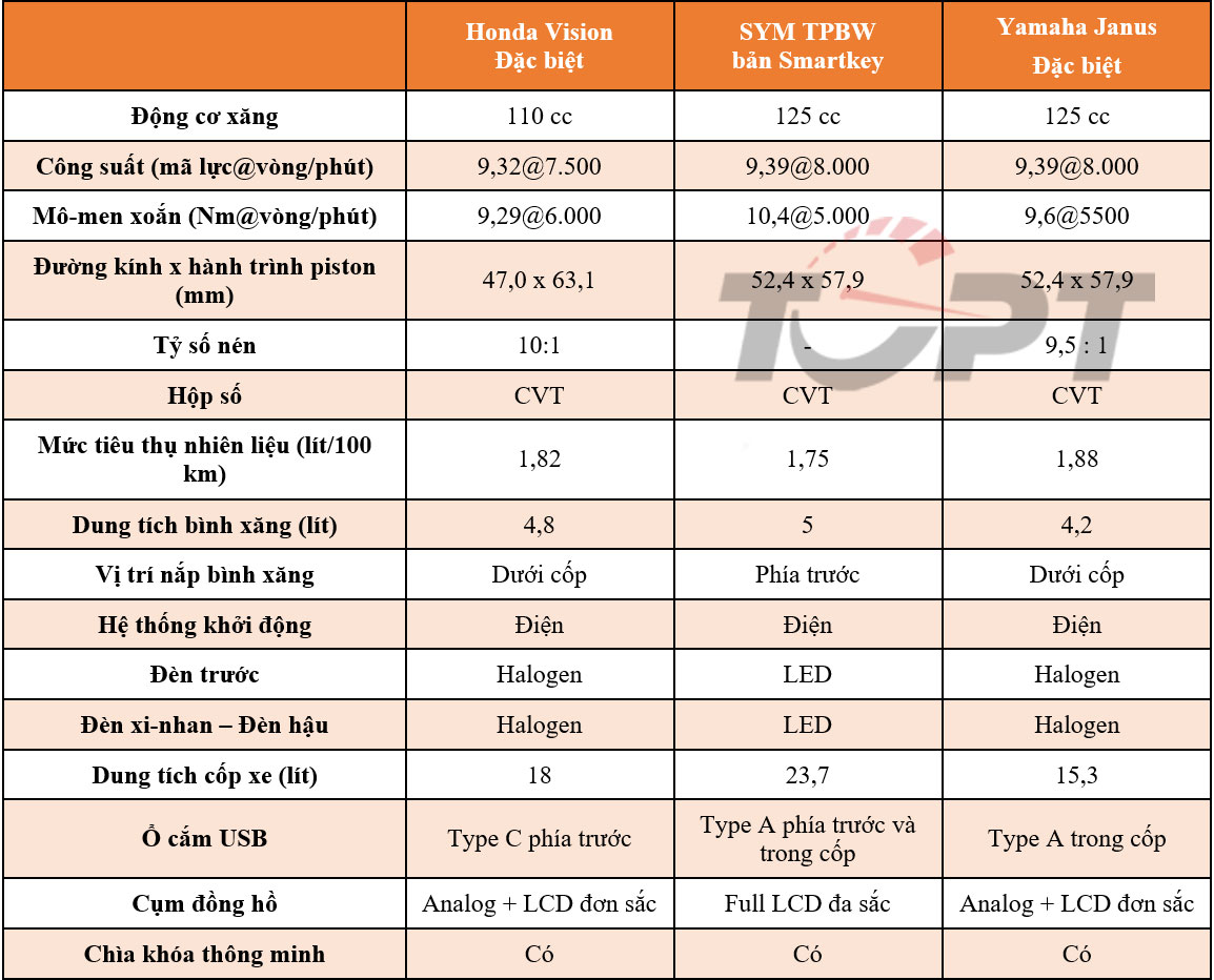 Trong khi đó, Honda Vision mang lại sự gọn nhẹ, sở hữu khá nhiều tiện ích tốt trong phân khúc và đang có lượng người dùng khá lớn, đây được cho sẽ tiếp tục là mẫu xe tay ga phổ thông bán chạy nhất trong thời gian tới. Yamaha Janus với không quá nhiều điểm nổi bật dự kiến sẽ khó hút khách sau sự xuất hiện của SYM TPBW 125, cùng với xu hướng điện hóa mạnh mẽ tại Việt Nam hiện nay.