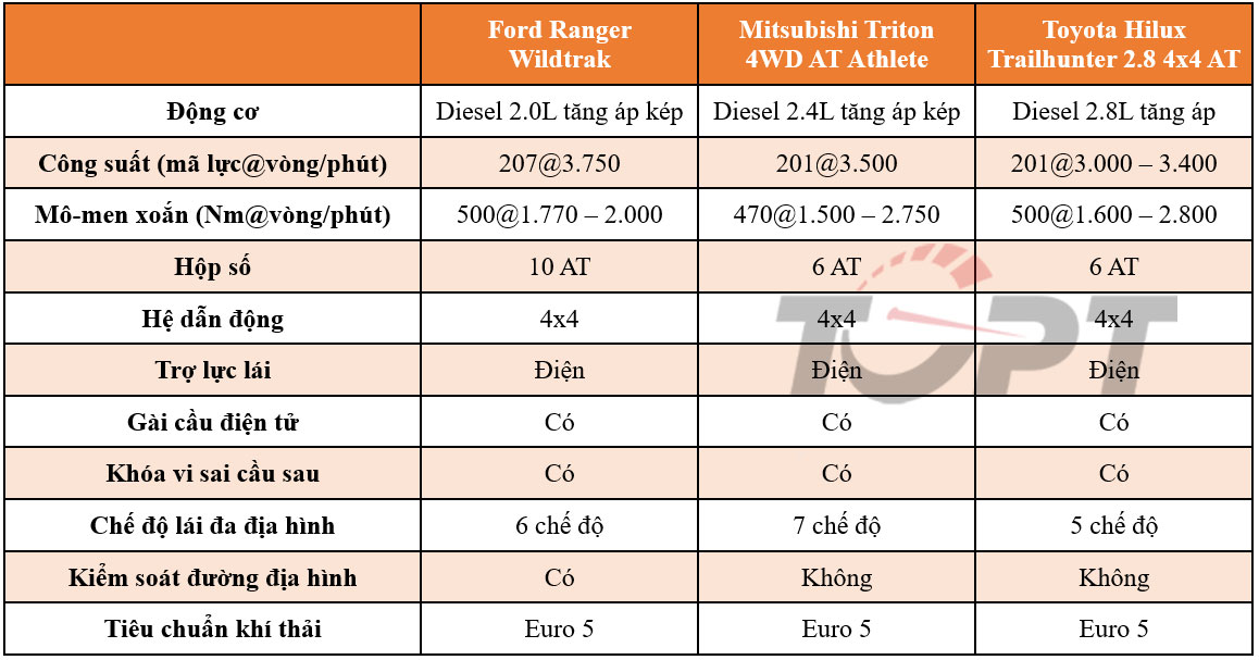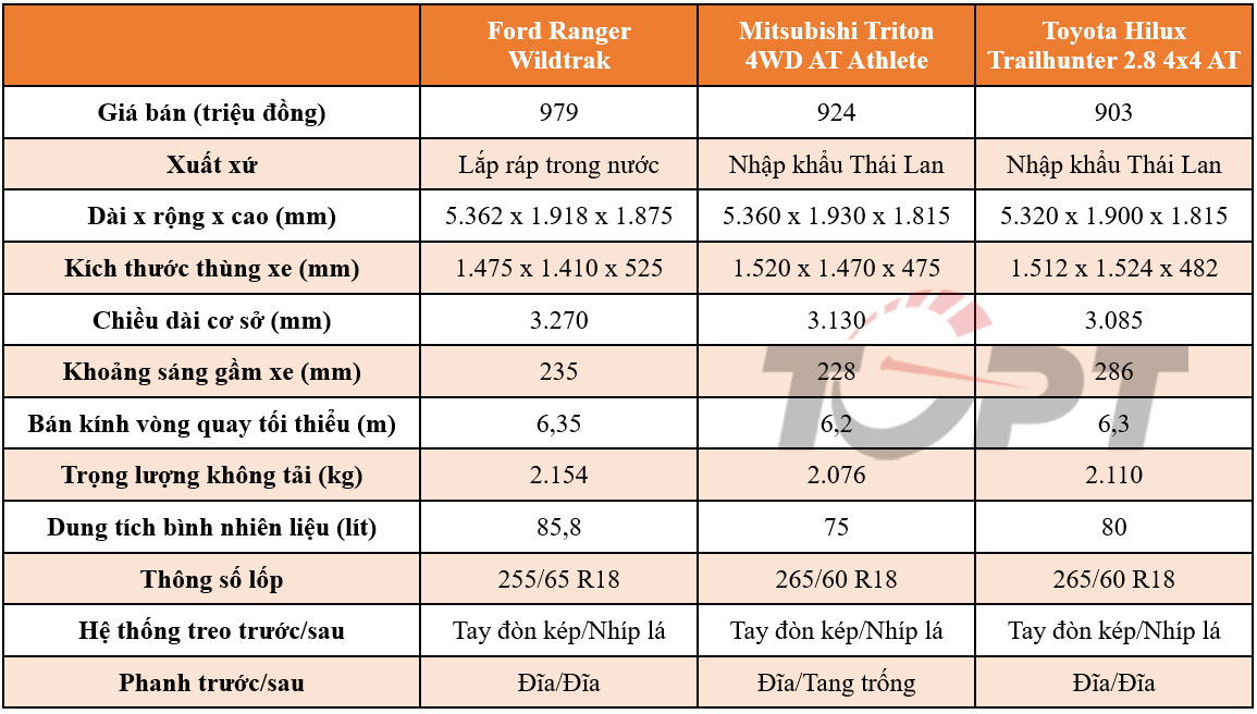 Có thể thấy, Toyota Hilux Trailhunter đang là món hời lớn nhất khi có giá bán dễ tiếp cận nhưng tích hợp các trang bị không hề thua kém so với Ford Ranger Wildtrak, hứa hẹn mang lại cuộc cạnh tranh đầy thú vị trong thời gian tới. Trong khi đó, Mitsubishi Triton Athlete vẫn mang vai trò của "món gia vị", để tránh cho cuộc đối đầu của Ranger và Hilux quá nhàm chán tại phân khúc bán tải tại Việt Nam, vị thế này thể hiện qua doanh số khi mà trang bị và cả giá bán của Triton nói chung chưa thực sự tạo ra sự khác biệt thu hút được sự quan tâm của người tiêu dùng.