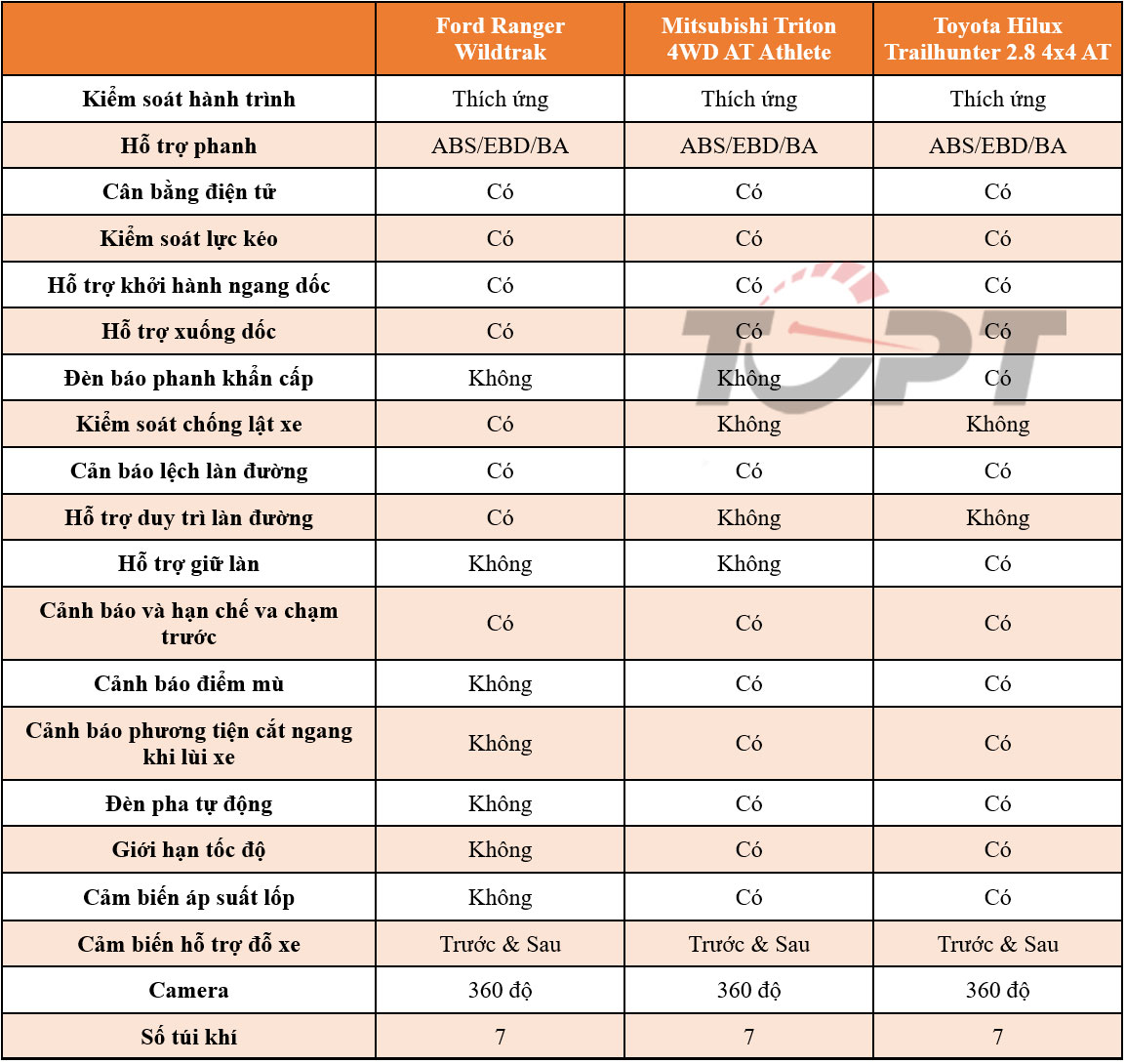 Mitsubishi Triton và Toyota Hilux đều được trang bị đầy đủ cảnh báo điểm mù và cảnh báo phương tiện cắt ngang khi lùi xe, trong khi Ranger Wildtrak lại thiếu vắng hai tính năng khá quan trọng này.