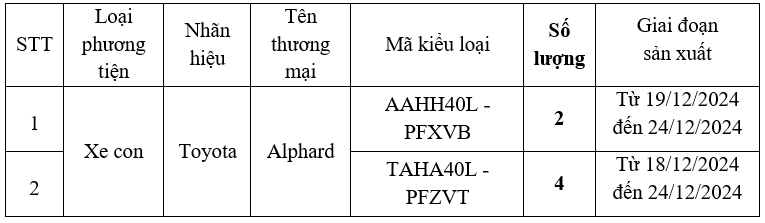 Theo thông báo của Ủy ban Cạnh tranh Quốc gia (Bộ Công Thương), Toyota Việt Nam (TMV) sẽ phải triệu hồi mẫu xe Alphard để thay thế bộ phận phân phối nguồn của hệ thống sấy kính sau. Tổng cộng có 6 chiếc bị ảnh hưởng đã bán ra thị trường với hai phiên bản, được sản xuất từ ngày 18/12/2024 đến ngày 24/12/2024 tại nhà máy ở Nhật Bản.