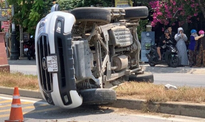 Ảnh TNGT: Ford Everest BKS 76A 10356 bị Hyundai Elantra 76A 11631 đâm lật nghiêng giữa đường