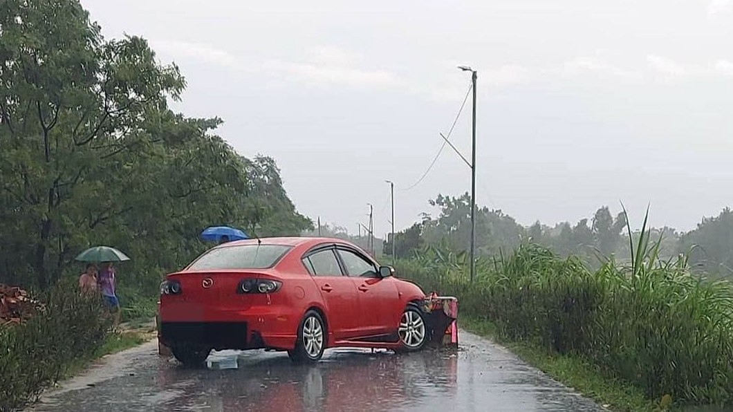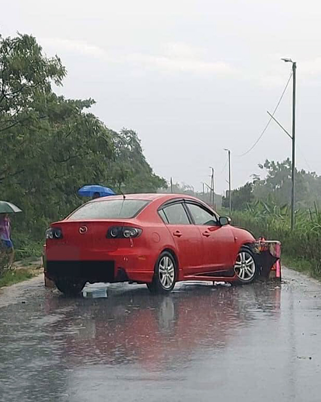 Ảnh TNGT: Mazda323 BKS 30H 71421 đâm cọc bê-tông vì trời mưa hạn chế tầm nhìn
